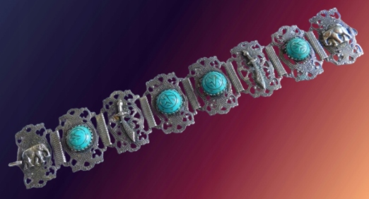 Еукціонний предмет - це браслет, видно на фотографії. Він був привезений з Німеччини - куплений на Тродельхаллі з ювелірними виробами. Основа -це срібний метал. Бірюзові очі прикрашають кілька гравірованих візерунків. Я не знаю, це природний камінь чи наслідування. Кріплення в старому стилі - для гачка. Стан, як на фотографії.