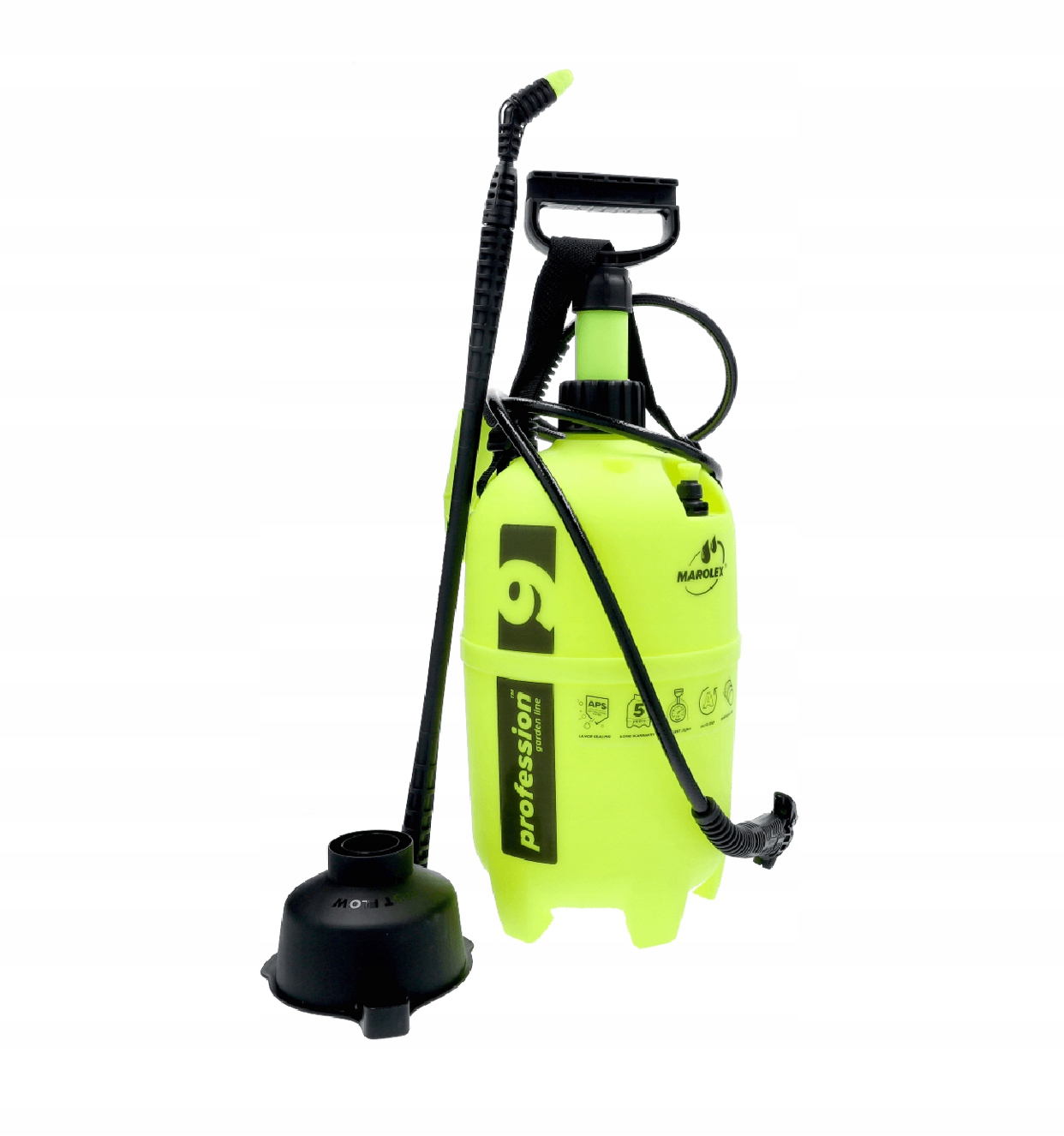 Marolex Profession 9 – це розпилювач під тиском середнього розміру. Широко використовується в теплицях, садах і там, де потрібне розпилення рідини під тиском. Використовується для обприскування засобами захисту рослин і рідкими добривами. Всі елементи обприскувача виготовлені з високоміцних і хімічно стійких матеріалів. Завдяки оптимальній потужності та міцній конструкції, а також насосу з підвищеною ефективністю, Profession 9 підвищує комфорт роботи та значно скорочує цикли перекачування резервуарів.