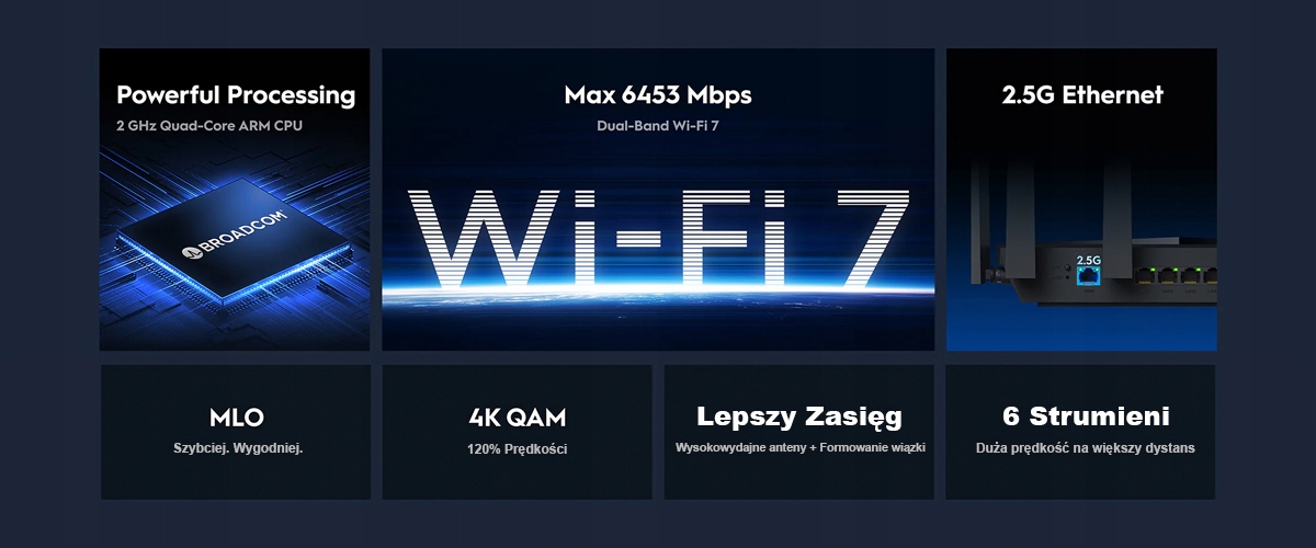Діапазон частот: 2,4 ГГц, 5 ГГц Тип антени: 6 x Всеспрямована антена - вбудована Стандарти: WiFi 7 Швидкість передачі: 688 Мбіт/с + 5765 Мбіт/с Порти LAN: 1 x 10/100/1000/2500 Мбіт/с - WAN