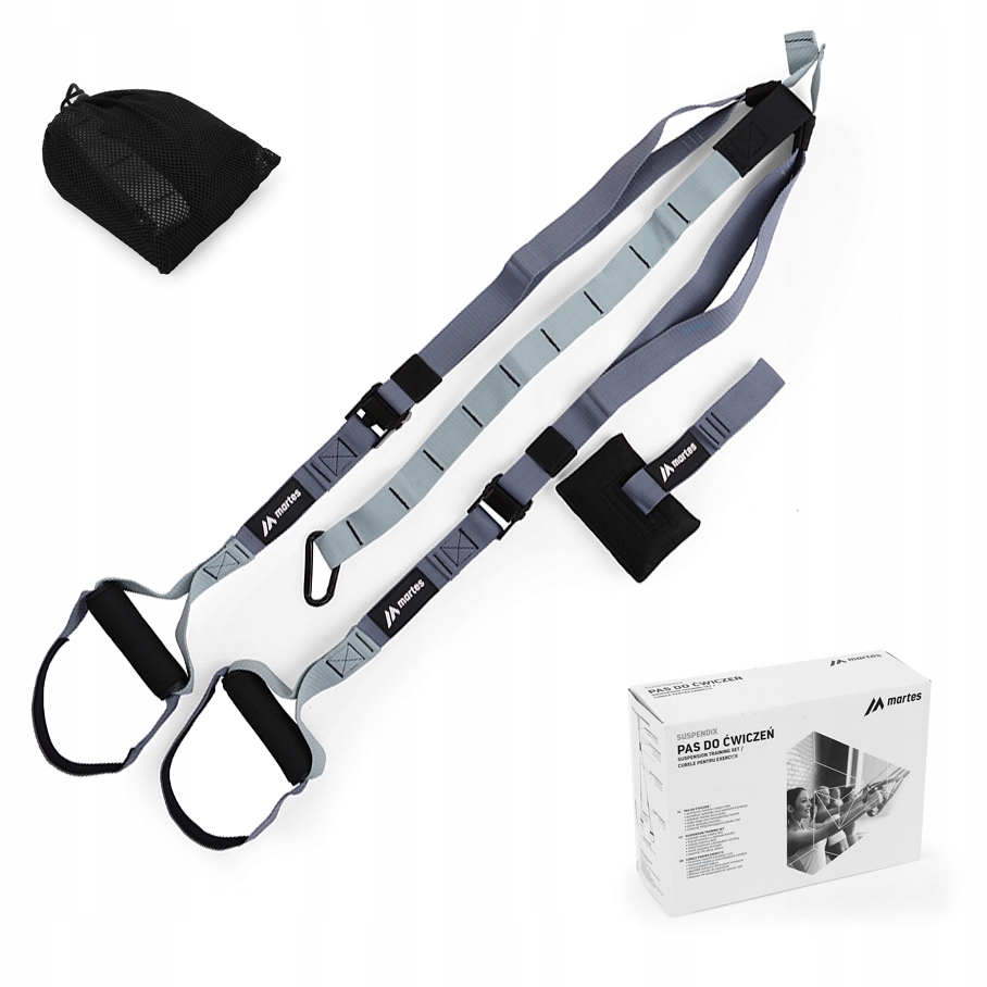 Тренировичні стрічки TRX — це універсальний пристрій для зміцнення м’язів, який використовує вагу вашого тіла. Система складається зі стрічок, які легко кріпляться до дверей, дерева або будь-якої опорної точки. Кінці лямок оснащені м'якими ручками для рук або ніг. Проста, але дуже ефективна система зміцнення, яка використовує власну вагу користувача, швидко стала дуже популярною формою для всіх, головним чином завдяки своїй високій ефективності та низькій ціні. Після легкої установки MultiTrainer Martes дозволяє максимально зміцнити м'язи всього тіла. Основними перевагами стрічок є низька вартість, висока ефективність і простота зберігання. Кінці ременів оснащені нековзкими ручками. У набір входить набір з'єднувальних кабелів, включаючи карабіни та наконечники для кріплення до закритих дверей, упаковка для зручного зберігання та поводження з предметом. Ремінці Martes Suspendix є ідеальним пристроєм для досягнення сили, гнучкості, витривалості, рівноваги та фізичної форми.
