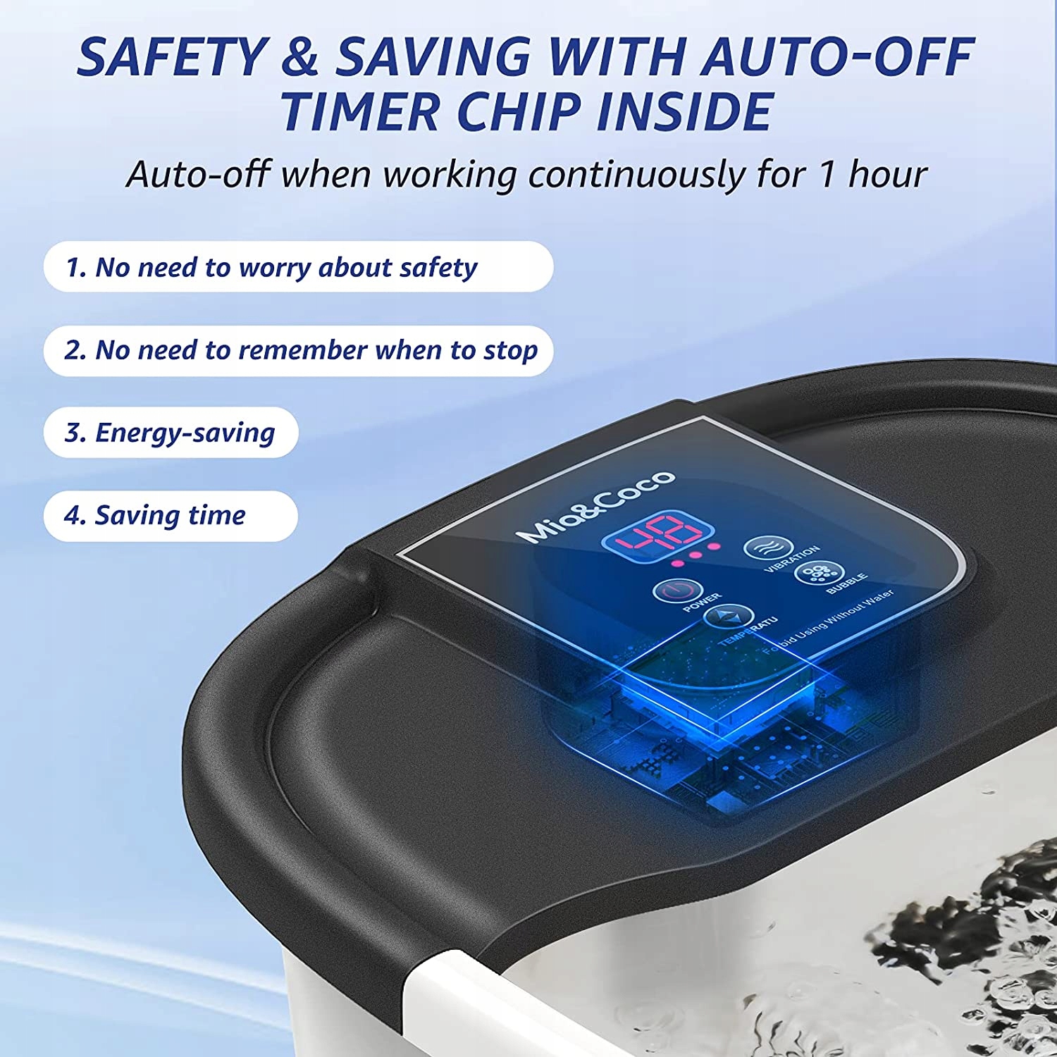 - Насолоджуйтеся теплою водою - ️ Встановіть температуру, потім нагрійте воду навколо ваших ніг, датчик контролює температуру та контролює нагрівальний блок для підтримки води на заданому рівні, від 35°C до 48°C, значення за замовчуванням 42°C.