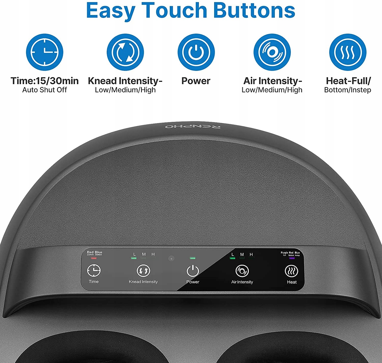 Цей масажер для ніг Renpho ергономічно розроблений, щоб доповнити структуру людської стопи для максимальний комфорт. Крім того, пристрій оснащено сенсорним екраном і пультом дистанційного керування, який дозволяє легко керувати пристроєм, не нахиляючись.