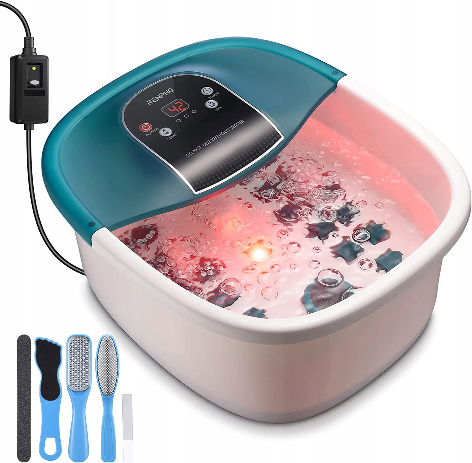 - 6 моторизованих роликів, педикюрний камінь і потужні повітряні бульбашки. 6 масажних роликів стимулюють точки акупунктури, а камінь для педикюру допомагає видалити мозолі та відмерлі тканини на стопах. Потужна функція повітряних бульбашок забезпечує рівномірний нагрів води та забезпечує комфортне купання ніг. Також є невелика коробка для ліків, де можна зберігати сіль Епсома, чай тощо для кращого розслаблення.