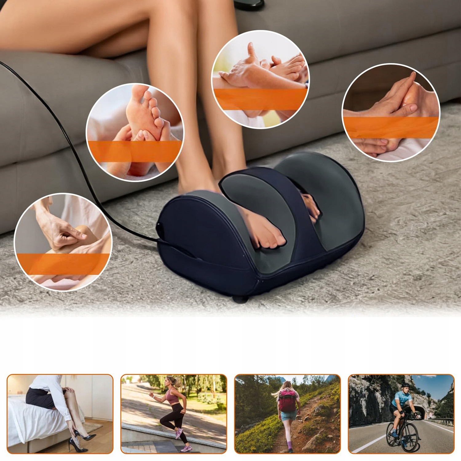Чисте полегшення та повне покриття: регульована планка нового дизайну дозволяє повністю масажувати стопи, щиколотки, гомілки, литки, підступи та п’яти. Бездротовий пульт дистанційного керування дозволяє зручно регулювати параметри комфорту, не нахиляючись. Полегшення підошовного фасціїту, невропатії, діабетичної нейропатії, хронічного болю, поганого кровообігу та багатьох інших станів.