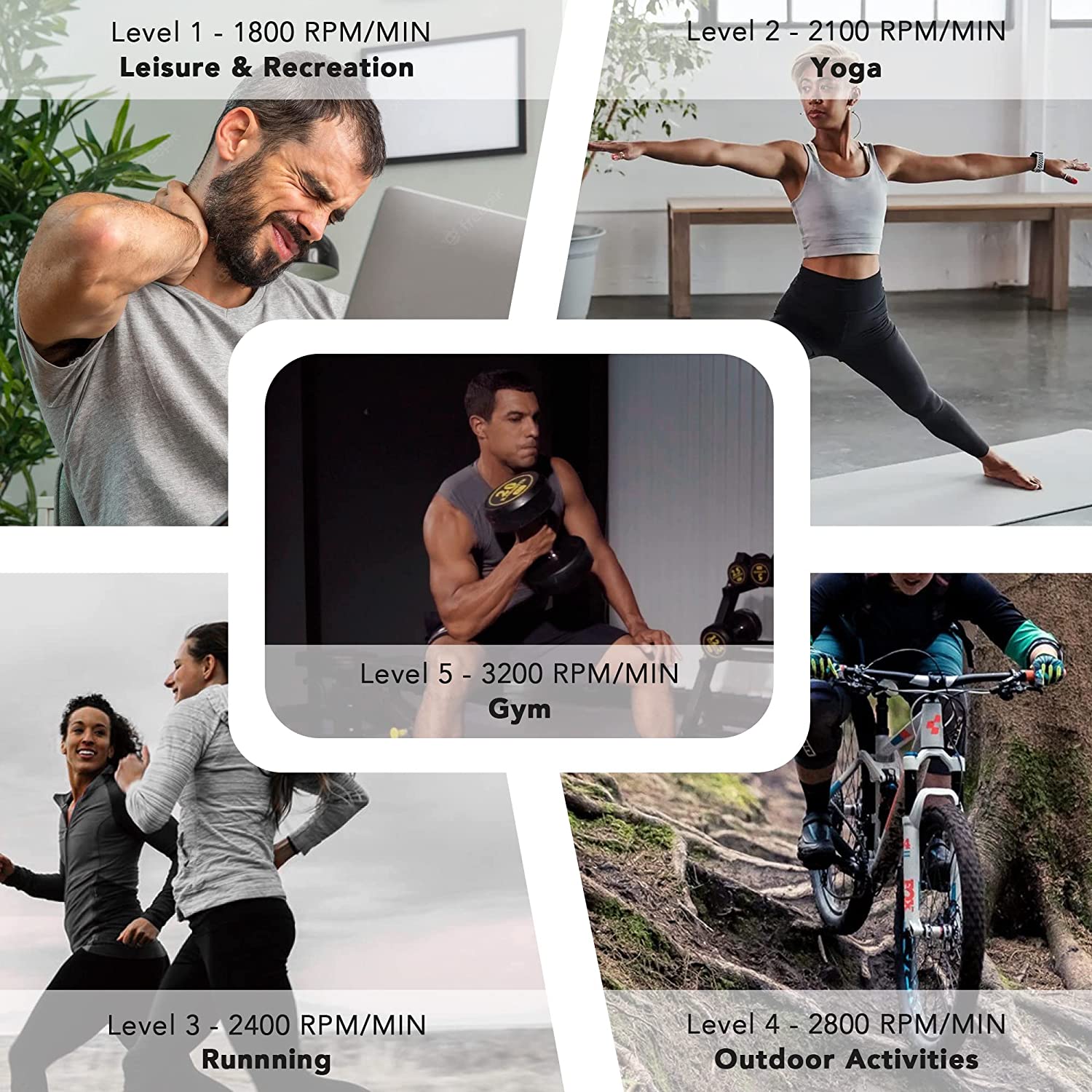 Побудований із нероз’ємною кульовою головкою та 2 змінними головками та 5 швидкостями від 1600 до 3200 об. через навчання або напружений день на роботі. Підходить для людей, включаючи спортсменів, бігунів, офісних працівників і водіїв. Незамінний у кожному домі.