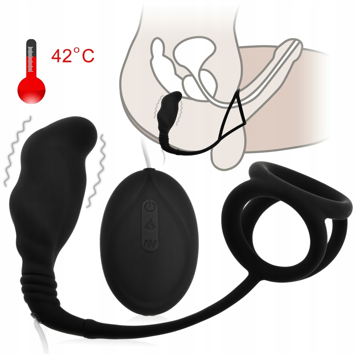 Найякісніший масажер простати, оснащений 7 дуже інтенсивними функціями вібрації та пульсації та функцією нагріву до 42 градусів Цельсія. Еротичний гаджет для чоловіків, які хочуть сильних відчуттів і бездоганної стимуляції. Маленька анальна пробка форми, яка ідеально підходить до чоловічої анатомії, точно вдаряється в простату, надаючи сильні подразники та відчуття, які важко описати. Чоловіки описують оргазм, досягнутий під час стимуляції передміхурової залози, як надзвичайно глибоке відчуття, зовсім інше, ніж під час оргазму, досягнутого традиційними методами. Пробка досить маленька, щоб ідеально підійти чоловікам, які тільки починають свою пригоду з пестощів ануса. Анальна пробка з’єднана з ерекційним кільцем для пеніса та яєчок. Силіконове кільце міцно оточує основу статевого члена і яєчок, підсилюючи ерекцію, дозволяючи відстрочити еякуляцію і довше підтримувати міцну ерекцію. Масажер ідеально підходить для соло або гри в дуеті. Під час статевого акту це максимізує ваші відчуття та дозволить вам займатися коханням довше. Продукт водонепроникний, ним зручно керувати за допомогою дротового пульта дистанційного керування.