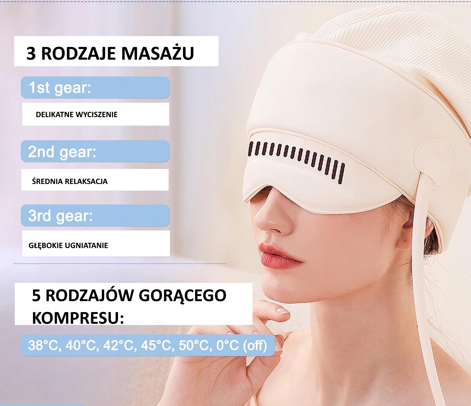 - використовуються для масажу голови та очей і послаблюють м’язи голови. li> коригування за допомогою адаптованих програм та гарячого компресу залежно від того, чи хочемо ми полегшити втому, зменшити стрес або розслабити настрій