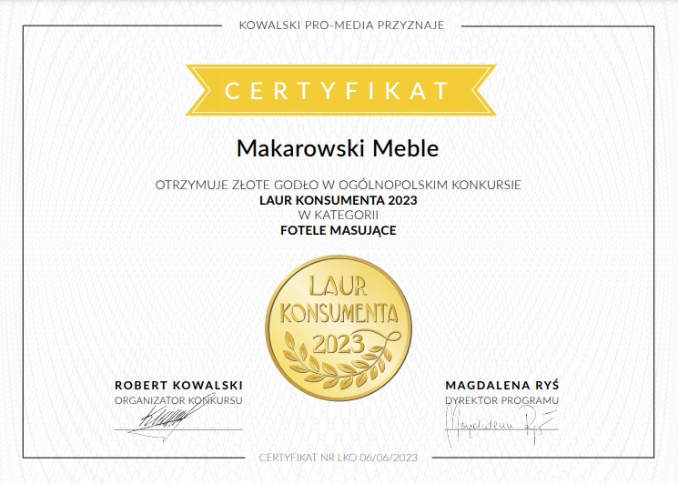 Наша компанія «Makarowski Meble» отримала ЗОЛОТИЙ ГЕРБ у національному плебісциті «Лавра споживача 2023» у номінації «Масажні крісла».
