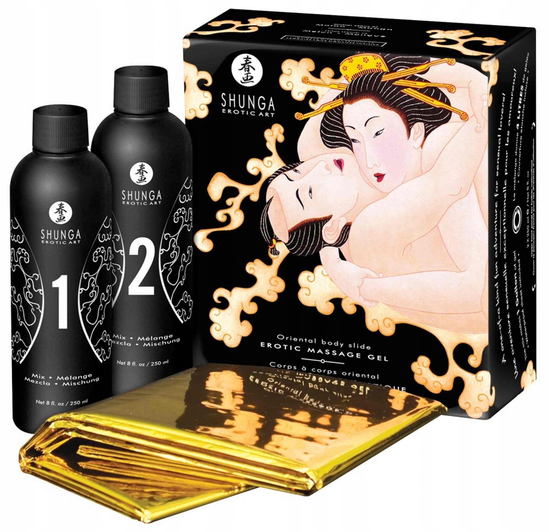 Розкішний набір для масажу Oriental Body Slide від Shunga, що складається з 2 флаконів масажного гелю Melon Mango та великої водонепроникної масажної подушки (фольги)