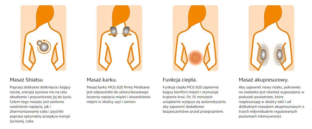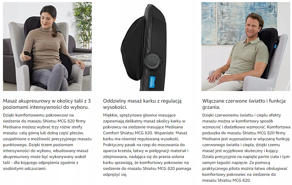 Комфортний масажний килимок Shiatsu MCG 820 від Medisana забезпечує виключно ніжний масаж "soft touch". Їх високоякісні гелеві масажні головки забезпечують природний, але ніжний масаж у вашому домі. Незалежно від того, чи це заспокійливий масаж спини шиацу, точковий масаж або точковий масаж для області талії з трьома рівнями інтенсивності, зручна накладка для сидіння шиацу MCG 820 допоможе вам розслабити напружені частини тіла та повністю розслабитися.