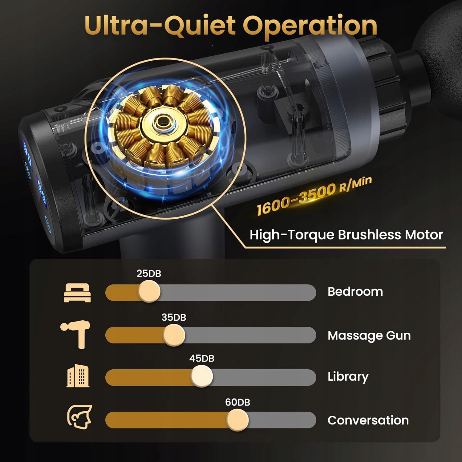 - Надтихий РК-сенсорний екран - Надтихий масажний пістолет до 45 дБ із технологією зменшення шуму. Використовуючи потужний безщітковий двигун із високим крутним моментом, масажний пістолет працює потужно від 1500 до 3200 ударів на хвилину, досягаючи глибини тканини 12 мм. Сенсорний РК-екран дозволяє вмикати чи вимикати або регулювати швидкість, а також показує залишок заряду в будь-який час.