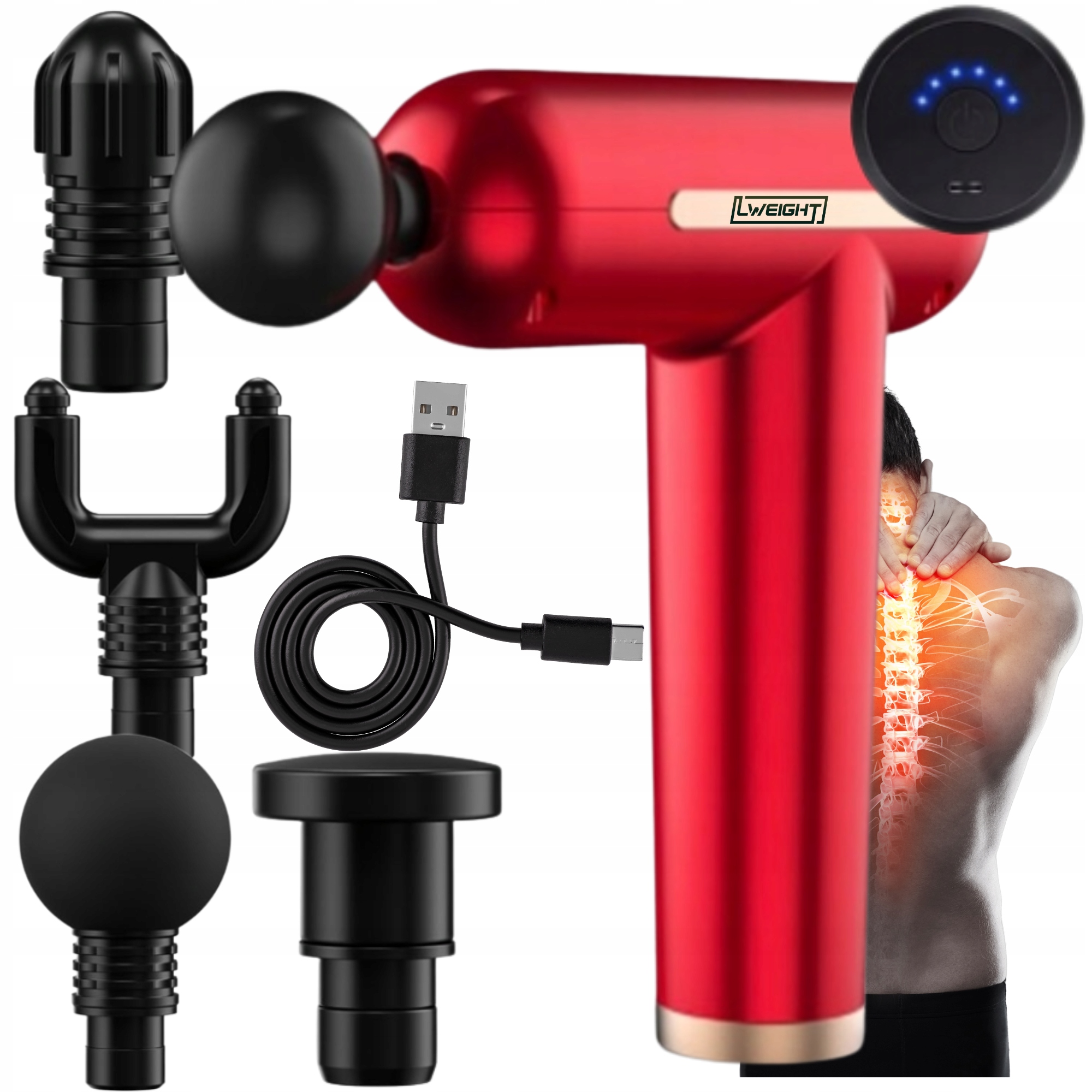 1. Плоска з вкладками - призначена для масажу великих ділянок тіла. Вкладки на її поверхні стимулюють тканини шкіри та м’язів, що сприяє поліпшенню кровообігу та підвищує ефективність масажу в регенерації м’язів та зменшення напруги. Куля - є одним з найбільш точних кінців. який можна використовувати, серед інших для інтенсивного масажу точки. Це ідеально усуває випромінюючі м’язові болі. Це дуже добре працює для масажу фасції та для тригерних точок. Дозволено використовувати масла/масажні агенти. Вгору -double - спеціально розроблений для ніжного м’язового масажу навколо хребців. із захистом сухожилля. Зосереджено на таких областях, як випрямляння телят. Круглий призначений для більших частин м’язів та масажу більш легкодоступних поверхонь тіла з середньою інтенсивністю та помірним тиском, наприклад, руки, шия, стегна, шлунок, а також біцепс, трицепс, телята. Він також чудово підходить для відпочинку та потепління.