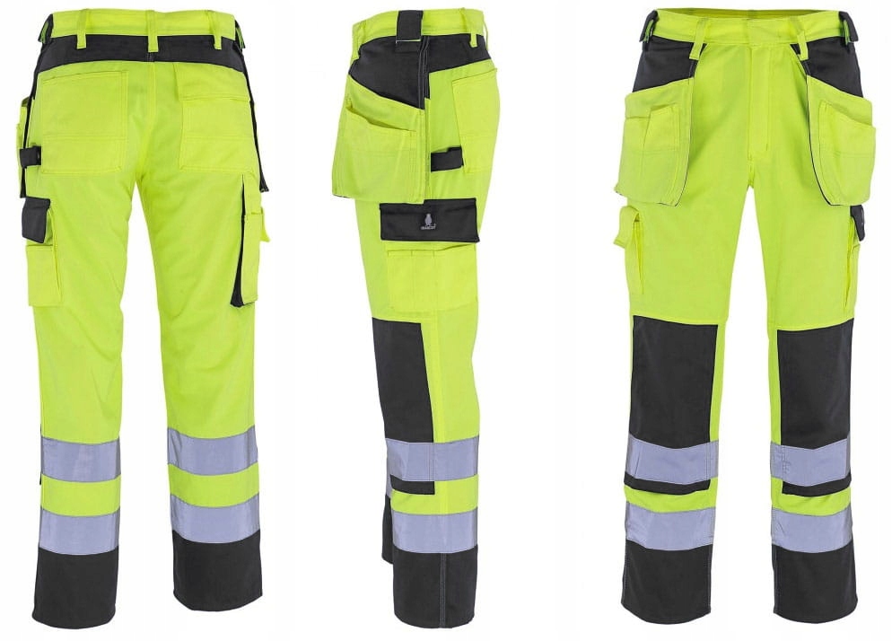 Люмінесцентні лампи з відбивачами. Teflon® робить виріб стійким до бруду. Двоколірний. Потрійні шви в області ніг і промежини. Шлевки для пояса. Тримачі для інструментів на талії, з двох сторін. Мушка застібається на блискавку. Підвісні кишені з