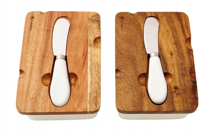 Естетично виготовлена порцелянова маслянка з кришкою з дерева акації та ножем для масла. Натуральний масив деревини забезпечує ідеальний дизайн кожній кришці. Ніж виготовлений з нержавіючої сталі та має порцелянову ручку.