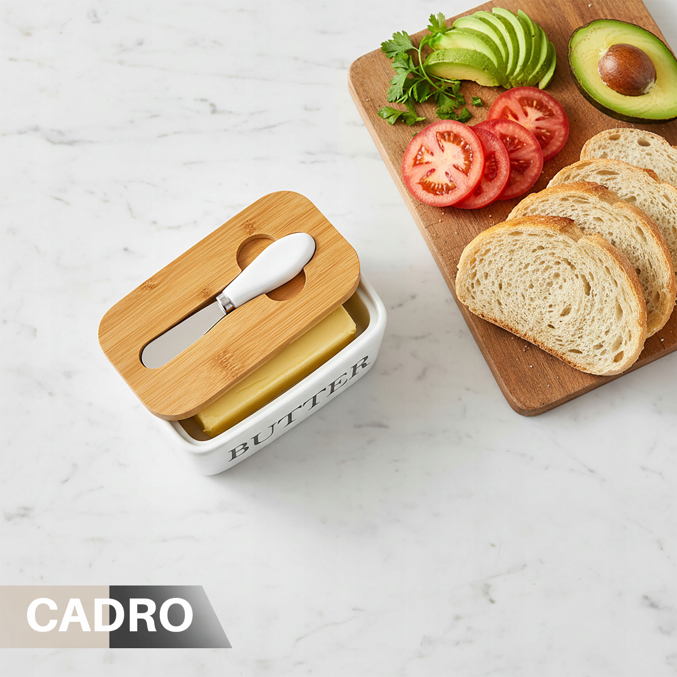 У набір входить ніж для масла, який має окреме місце в бамбуковій кришці. Завдяки цьому він завжди під рукою та гігієнічно зберігається.