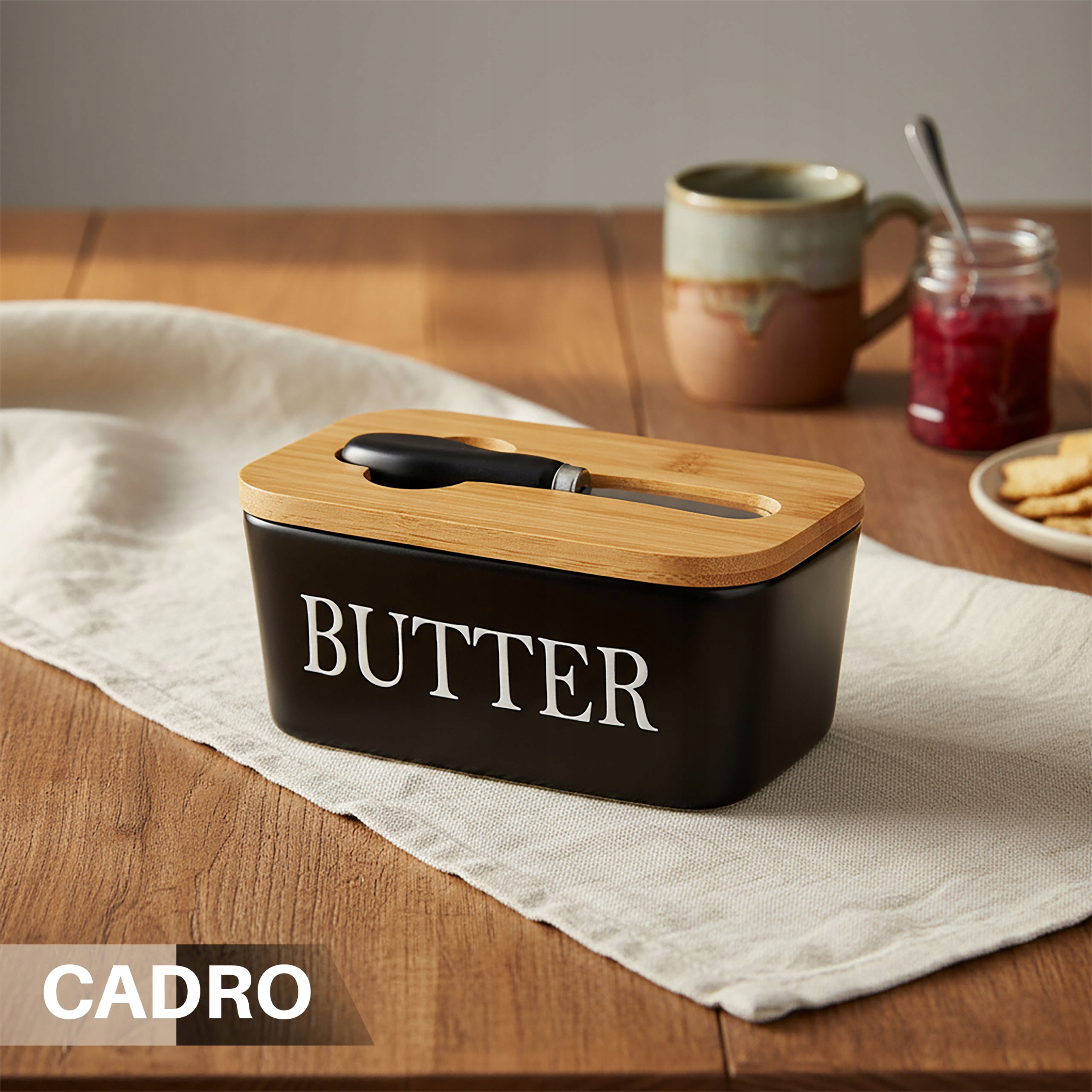 Елегантність і свіжість на вашому столі! Ця сучасна маслянка поєднує функціональність із модним дизайном. Виготовлена з чорної кераміки і покрита бамбуковою кришкою, маслянка ідеально вписується в сучасний інтер'єр. Ключовою перевагою є силіконовий ущільнювач, який забезпечує свіжість масла, і ніж у комплекті, який знаходиться в кришці.