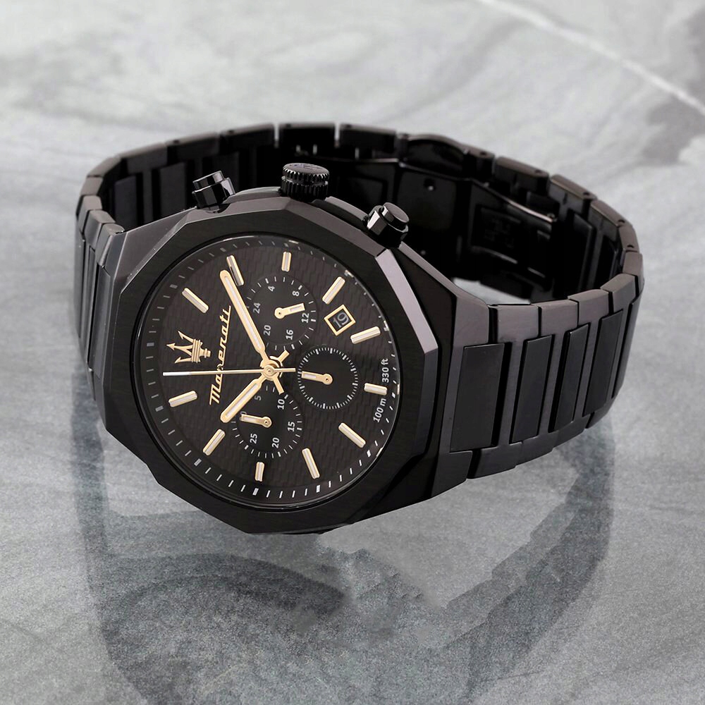 Maserati R8873642005 Watch - це класична модель, яка сподобається кожній людині. Годинники цього бренду з нетерпінням використовують шанувальники італійської, розкішної марки Maserati, а також людей, які шукають таймер, який можна носити щодня. Цей годинник був зроблений повністю з класичної чорної нержавіючої сталі, яка стійка до корозії. На чорному щиті, захищеному мінеральним склом, ми знайдемо підстарі, які є показаннями дня тижня, дня місяця та щоденного часу в золоті. Точний кварцовий механізм, що працює на батареї, відповідає за надійну роботу пристрою. Watch Maserati R8873642005 має клас водостійкості на 10 атм, а це означає, що він стійкий до контакту з водою, ви можете безпечно плавати в ньому.