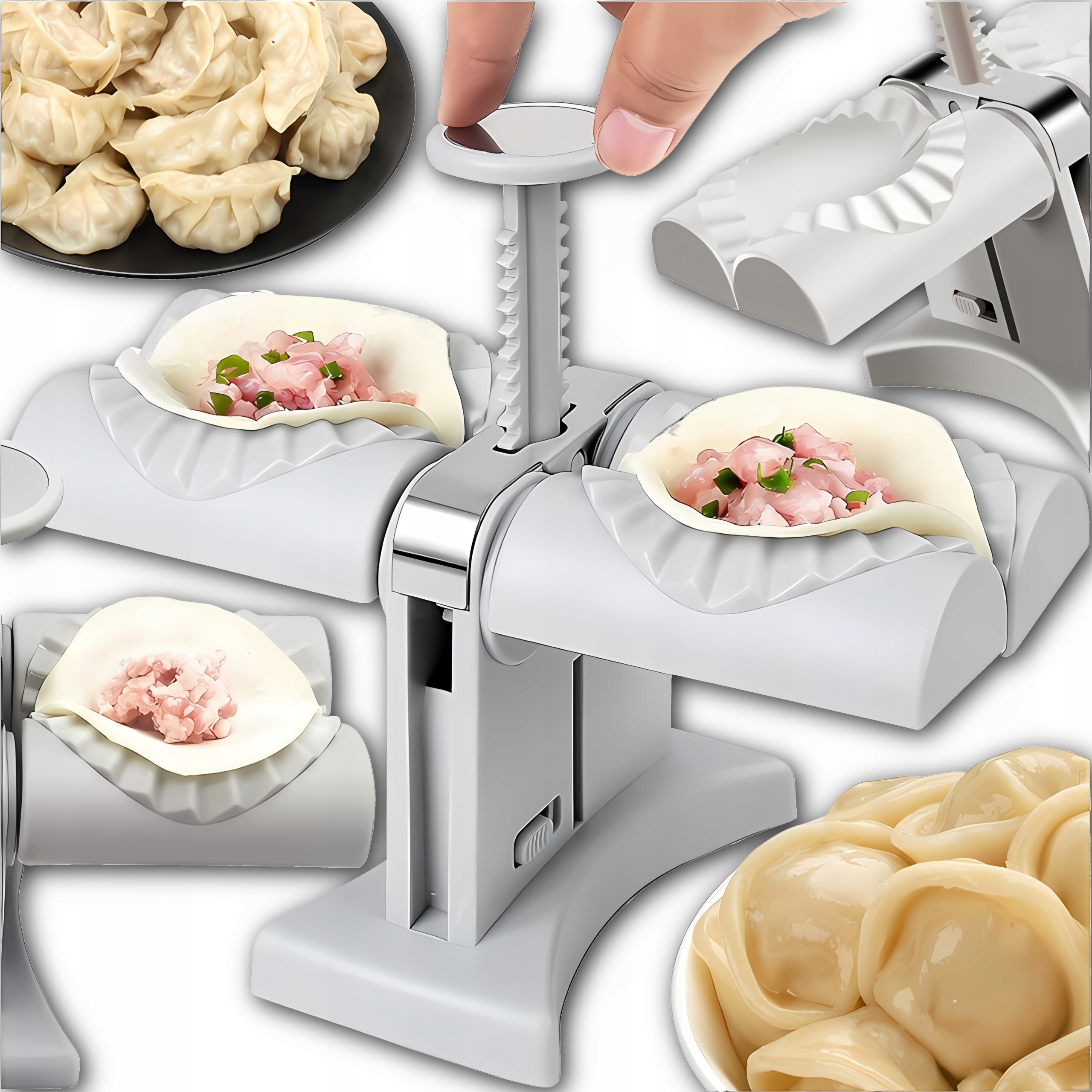 Для людини, яка готує пельмені у великих кількостях, це неймовірна економія часу. b> Просто натисніть кнопку, розташовану в центрі пристрою, і дві форми закриються, надаючи ідеальну форму пельменям.