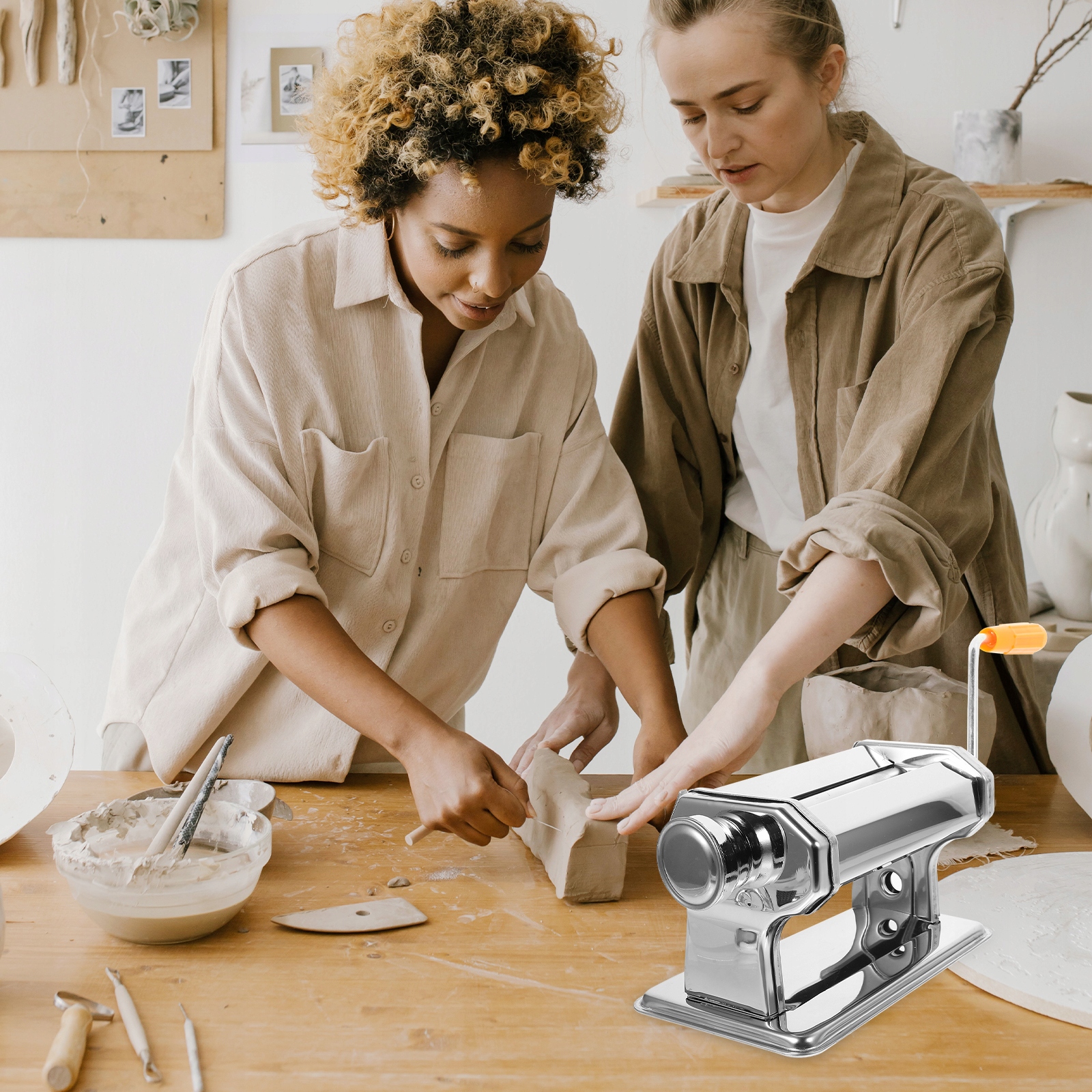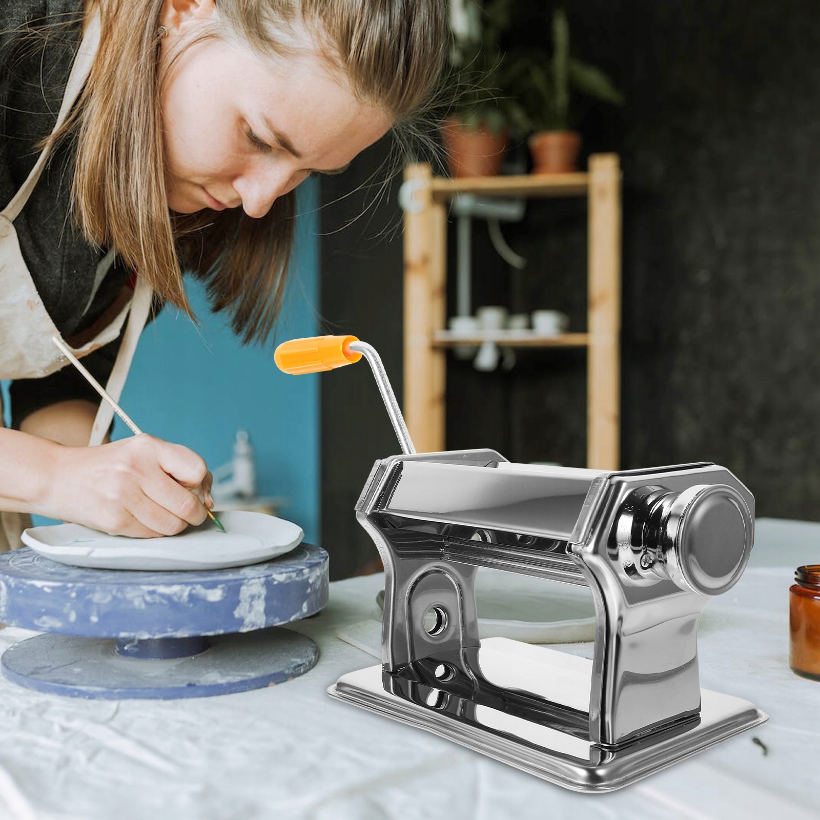 Цей продукт — рукоятка для глиняних валиків, виготовлена з нержавіючої сталі та пластику, досить практична та міцна у використанні. Можна використовувати для створення градієнтних кольорових аркушів. Ергономічна ручка, зручно тримати, працює швидко і без зусиль.