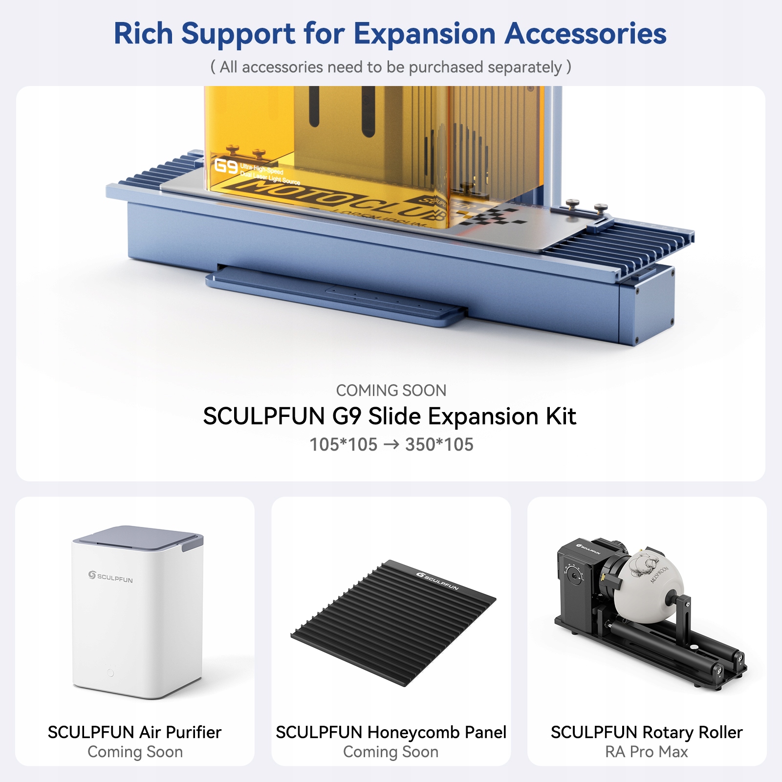 Гравер G9 можна використовувати з сумісним очищувачем повітря, розсувним подовжувачем G9 і поворотним блоком RA Pro Max. У поєднанні з очищувачем повітря ступінь очищення диму для гравіювання може досягати 99,97%, що дозволяє вам насолоджуватися рукоділлям вдома. Розсувні подовжувачі збільшують робочу зону до 3,5 разів, що ідеально підходить для групової роботи та великих проектів гравірування. RA Pro Max дозволяє вам розкрити свій творчий потенціал на нестандартних циліндрах, таких як склянки, кухлі, м’ячі та кільця.