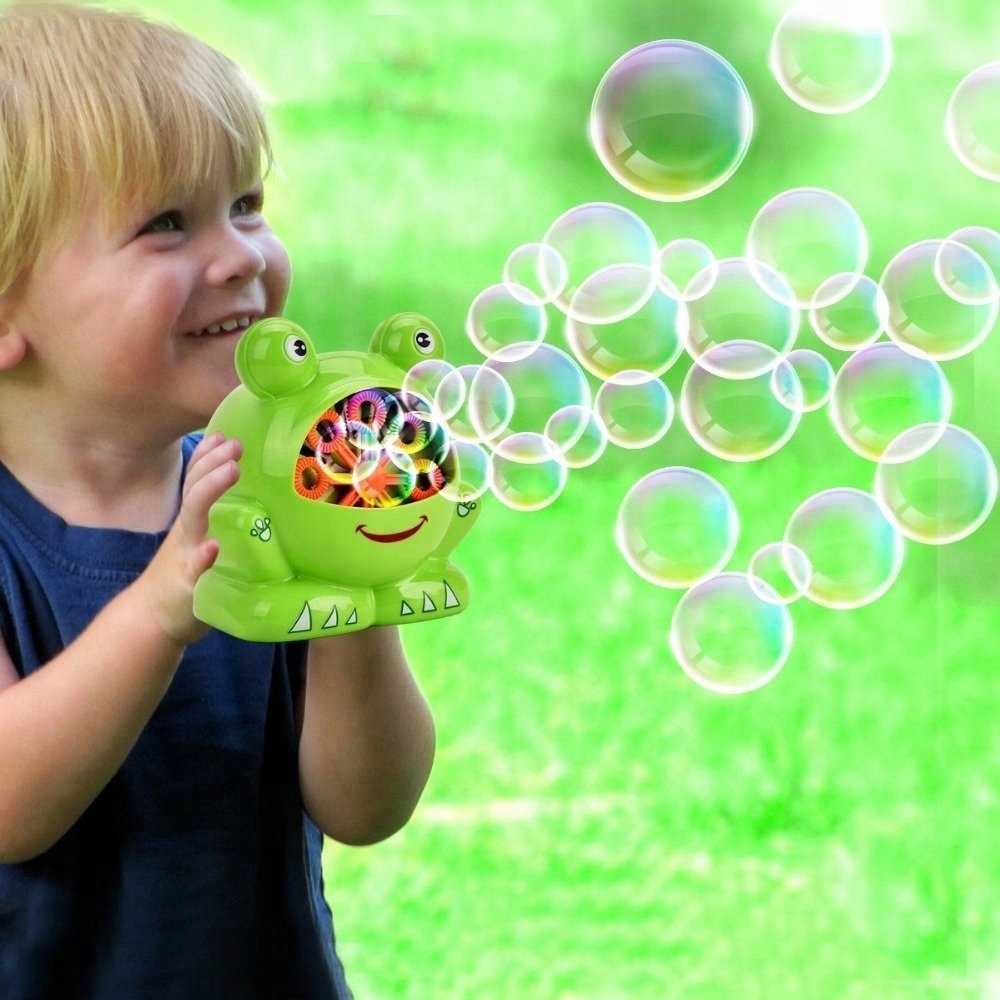 Ви можете пограти з жабою в саду тощо. Іграшка випускає велику кількість бульбашок одночасно. Щоб почати веселощі, налийте бульбашкову рідину, що входить до комплекту, у ємність, розміщену в роті жаби, а потім увімкніть її за допомогою кнопки на задній панелі. Готово!