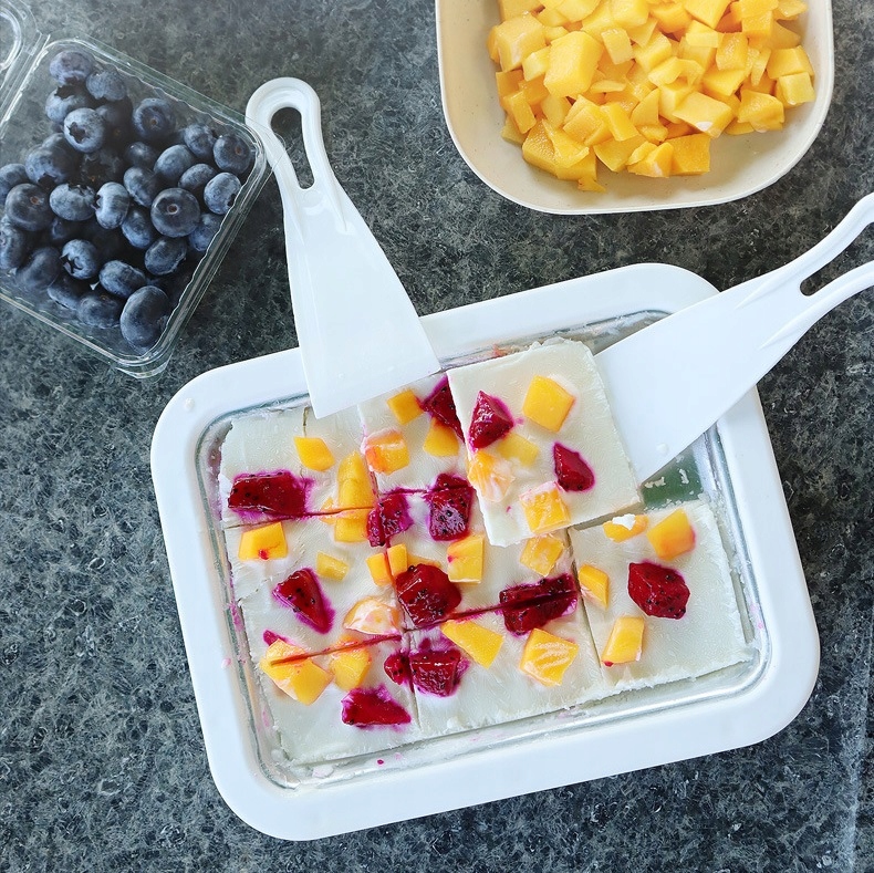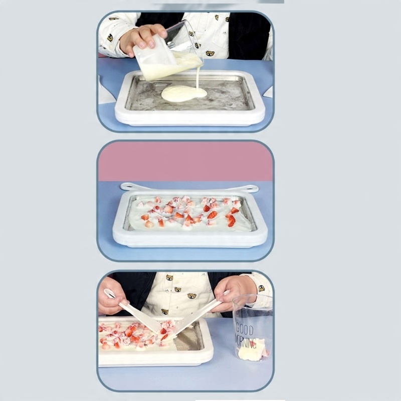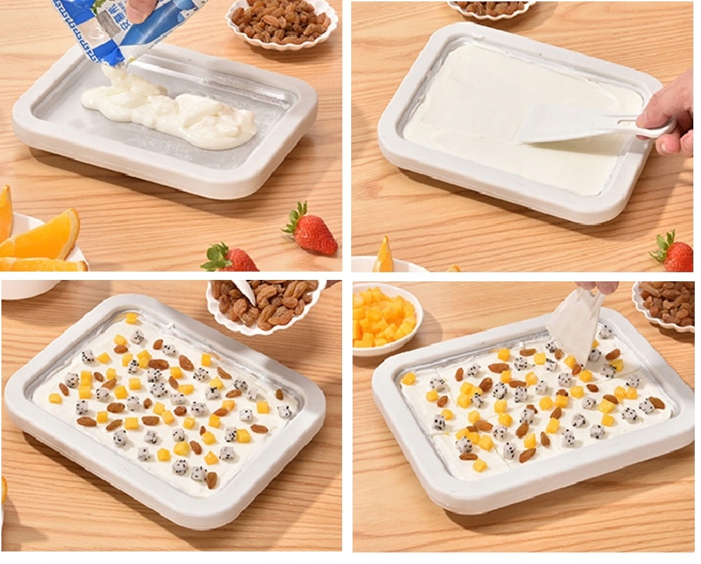 Наш лоток для морозива простий у використанні і дозволяє готувати різні смаки морозива. Просто змішайте інгредієнти, висипте їх на піднос і почніть формувати за власною ідеєю! Завдяки цьому ви можете експериментувати з різними смаками та добавками, такими як фрукти, горіхи тощо.