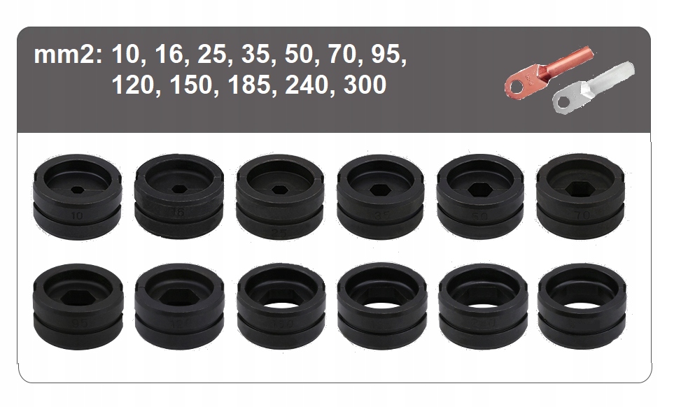 - Шестигранні матриці розмірами: 10, 16, 25, 35, 50, 70, 95, 120, 150, 185, 240, 300 мм2