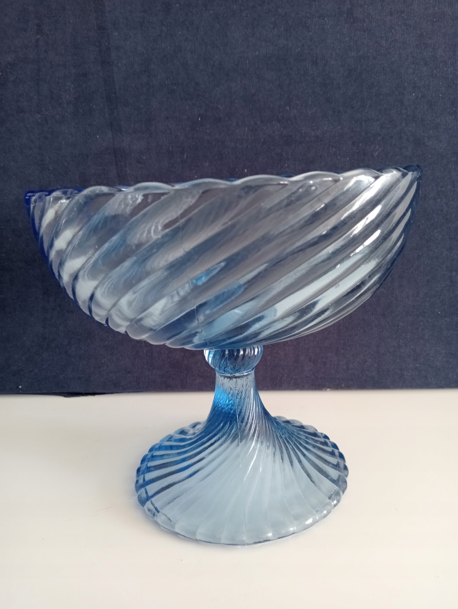 Тарілка - плодова тара з волошкового скла у формі чашки. Миска з хвилястим краєм і діагональними лініями. Ніжка - куля з розширеним донизу конусом і діагональними лініями. Кругла основа з діагональними лініями та хвилястим краєм. Зомбковіцький скляний завод.