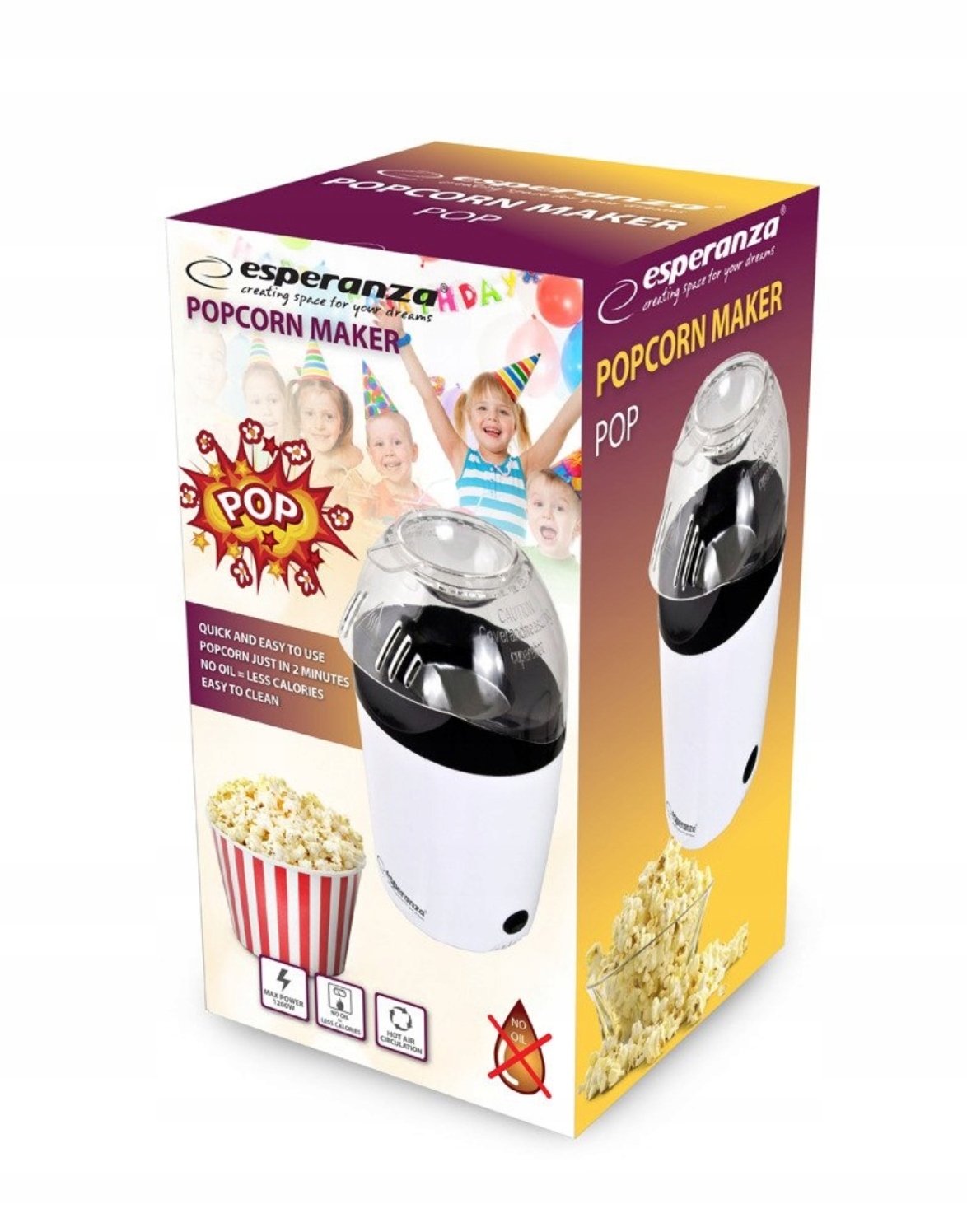Приготуйте корисну та смачну закуску всього за 2-3 хвилини завдяки попкорноварці Esperanza POP! Завдяки використанню циркуляції гарячого повітря попкорн готується абсолютно БЕЗ ЖИРУ, залишаючись при цьому легким і низькокалорійним. Насолоджуйтеся домашнім попкорном зі смаком кінотеатру - без бризок олії та непотрібних добавок!