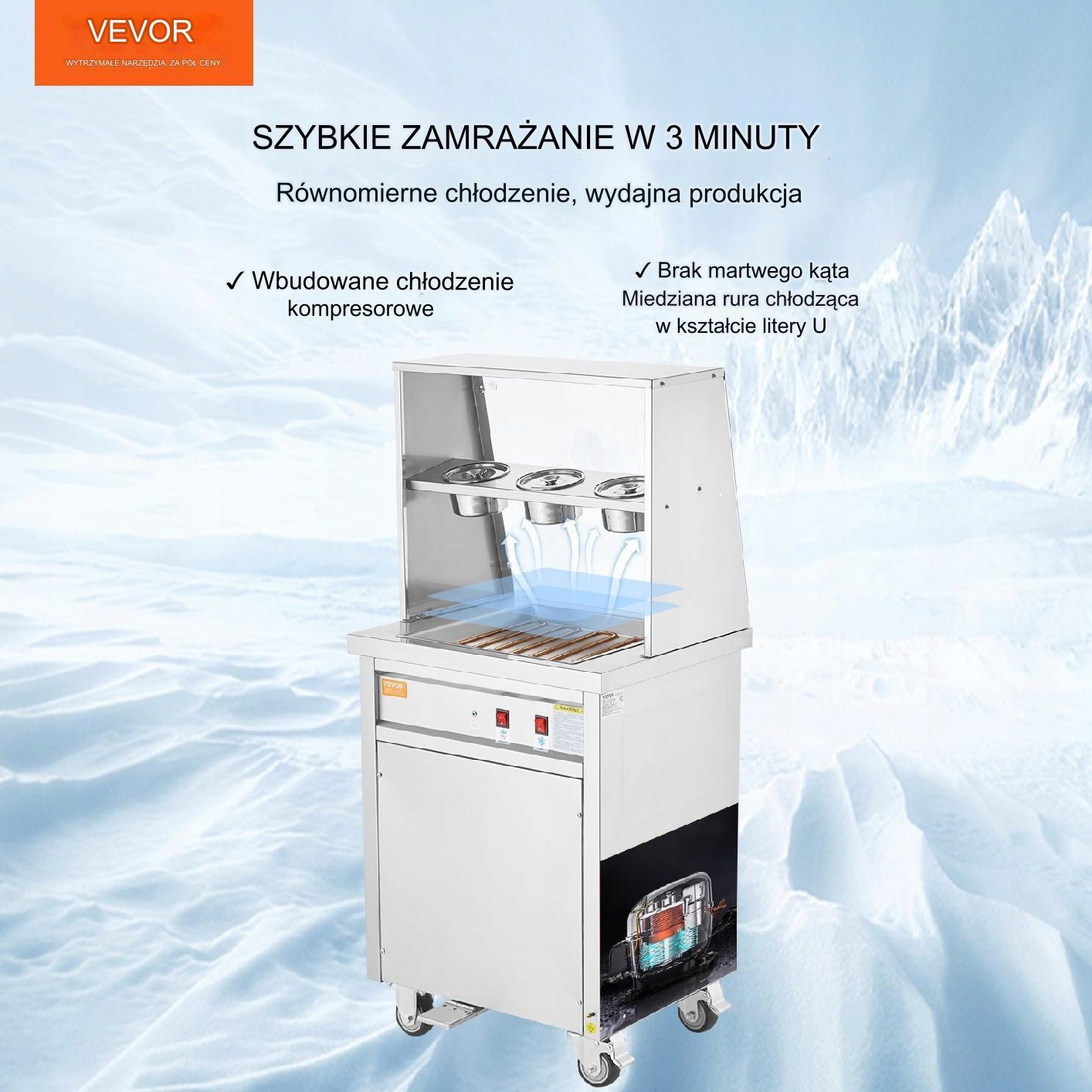 - Апарат для смаженого морозива оснащений інноваційною компресорною системою охолодження, яка в поєднанні з U-подібними безшовними мідними трубами дозволяє досягти очікуваної температури всього за 3 хвилини.