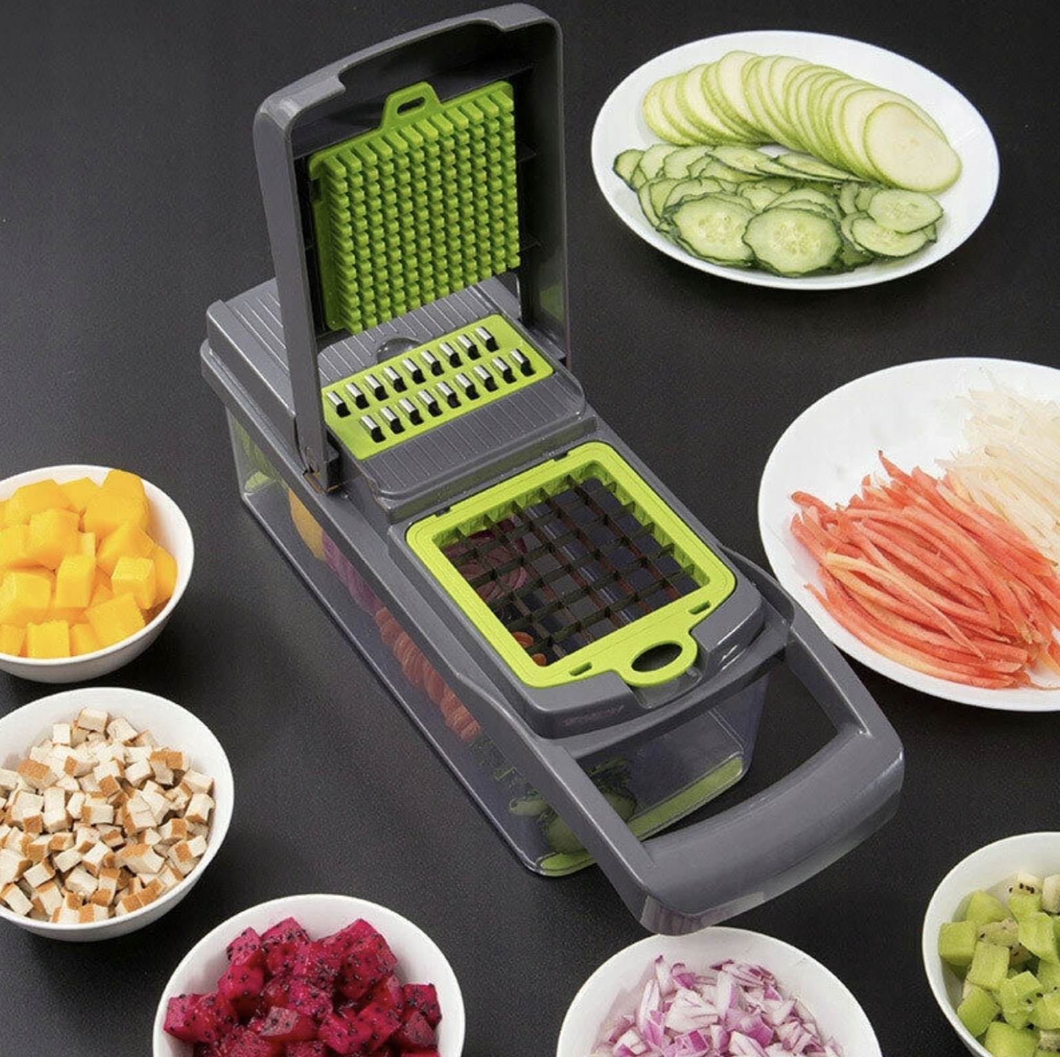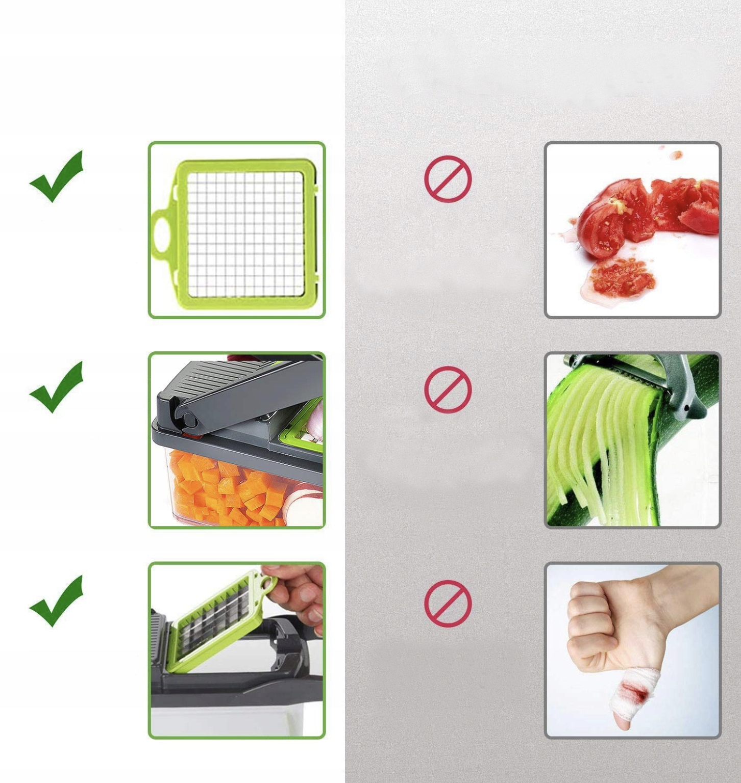 ►Овочерізка 13 в 1 має різноманітні функції, такі як нарізка, нарізання на смужки, нарізання кубиками різних розмірів, подрібнення, натирання та багато інших.