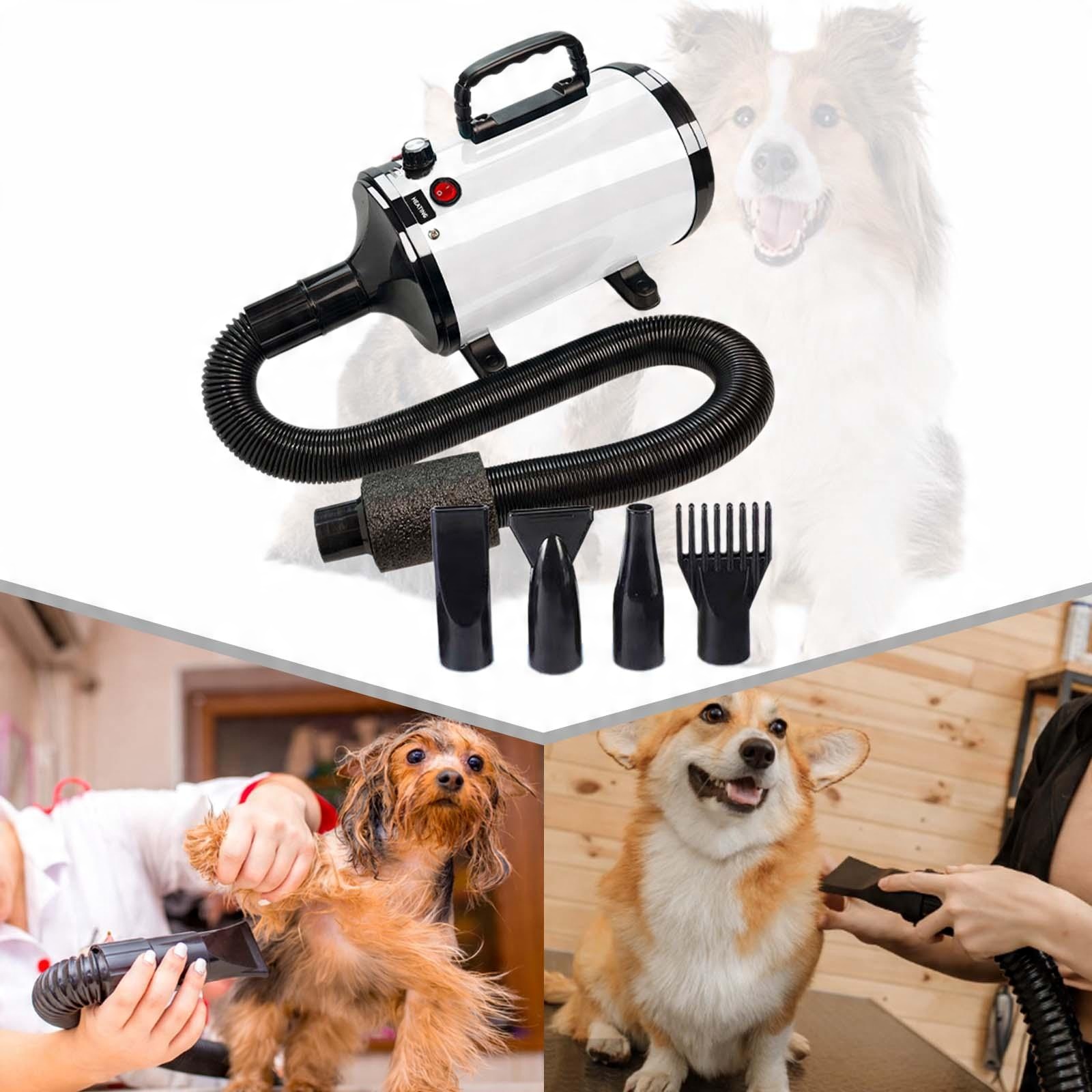 НАСАДКИ В КОМПЛЕКТІ: Фен для шерсті домашніх тварин із вентилятором оснащено шлангом і чотирма знімними насадками для догляду за домашніми тваринами, тож ви можете розчісувати їх під час сушіння.