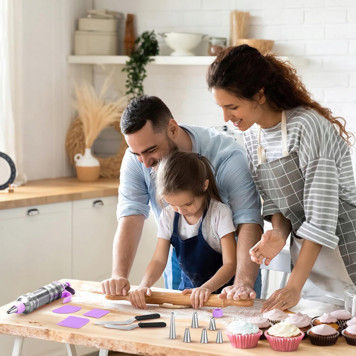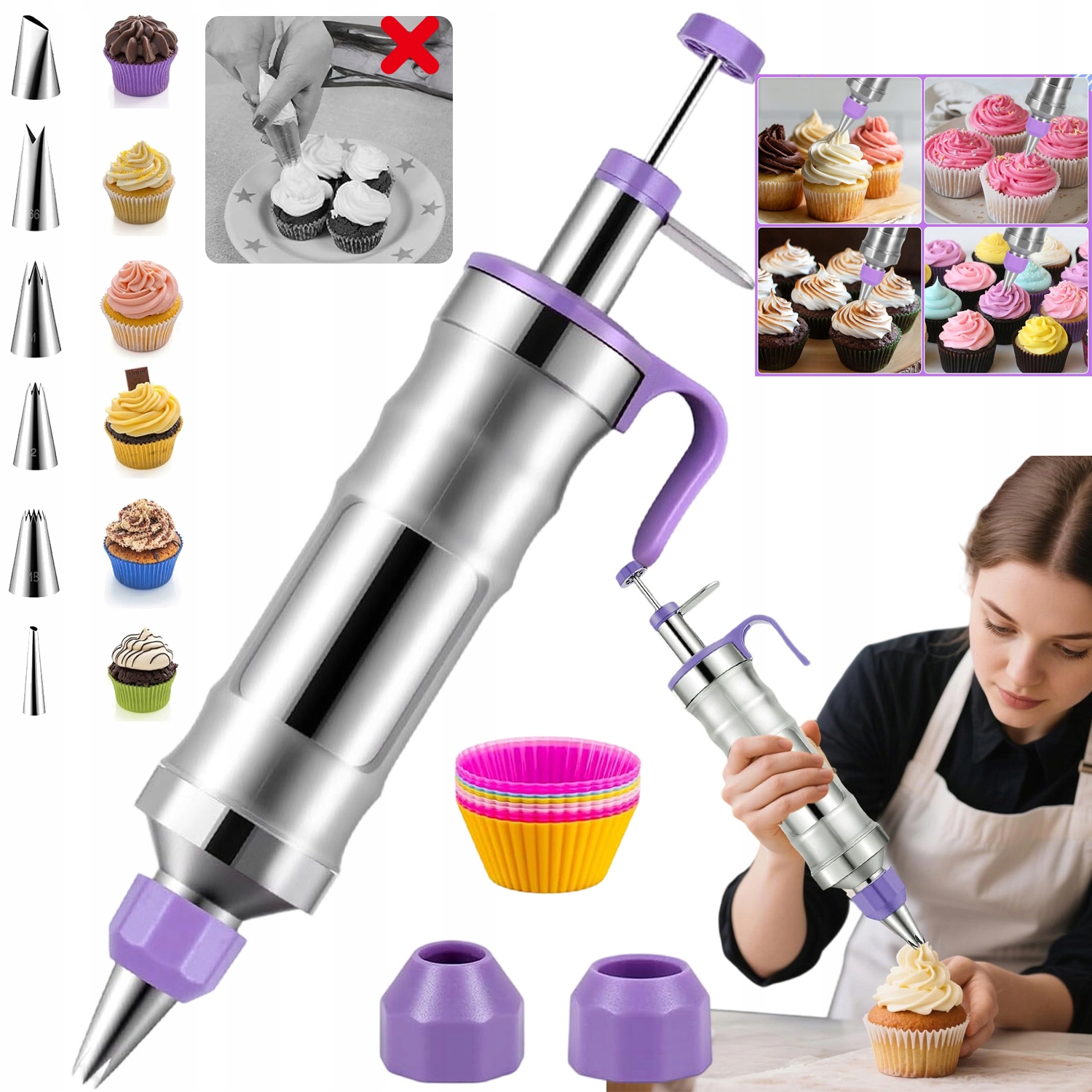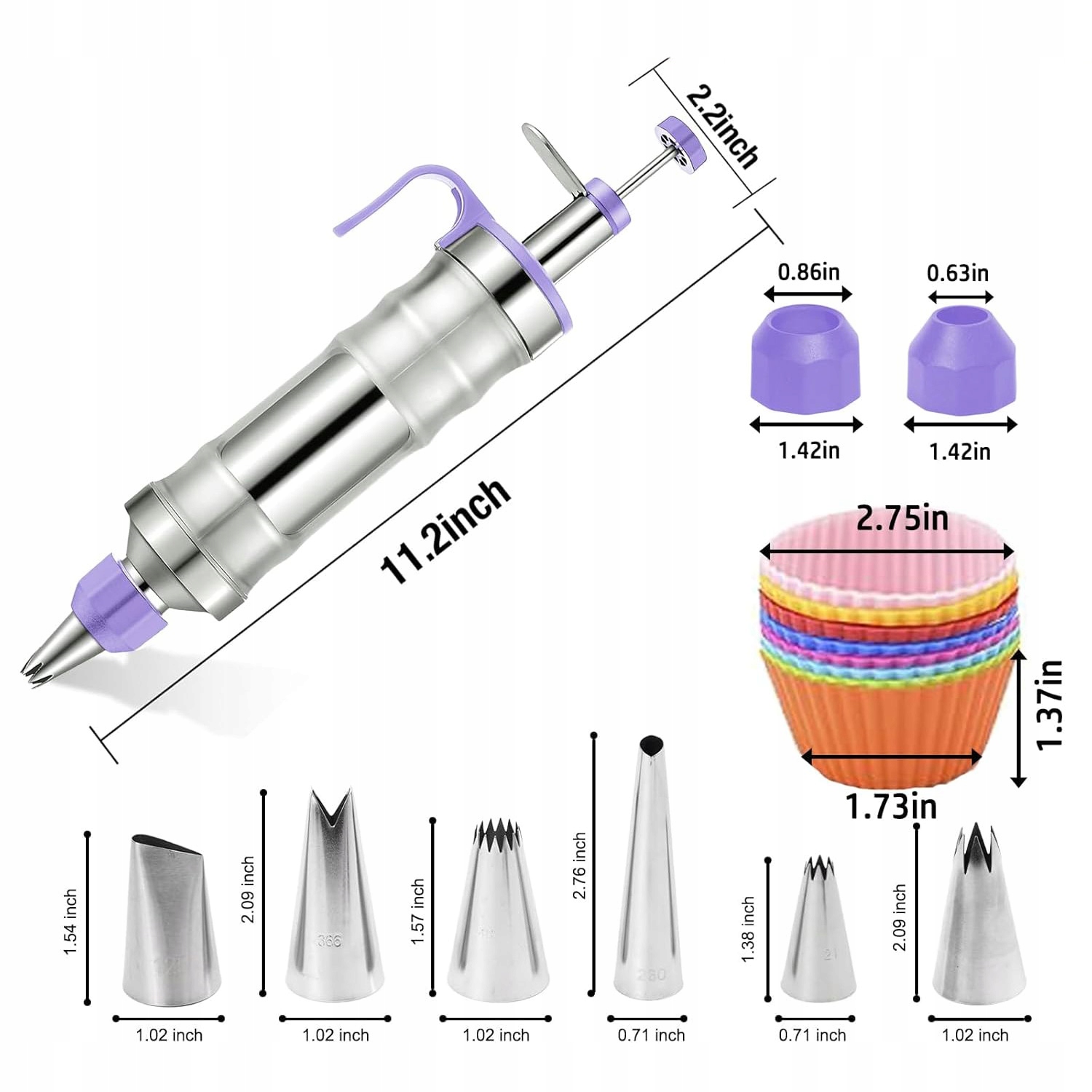 У набір входить пістолет для глазурі, 6 змінних наконечників для глазурі та 9 силіконових форм для кексів. Ці інструменти для прикраси тортів задовольнять ваші потреби в декоруванні тортів і печива.