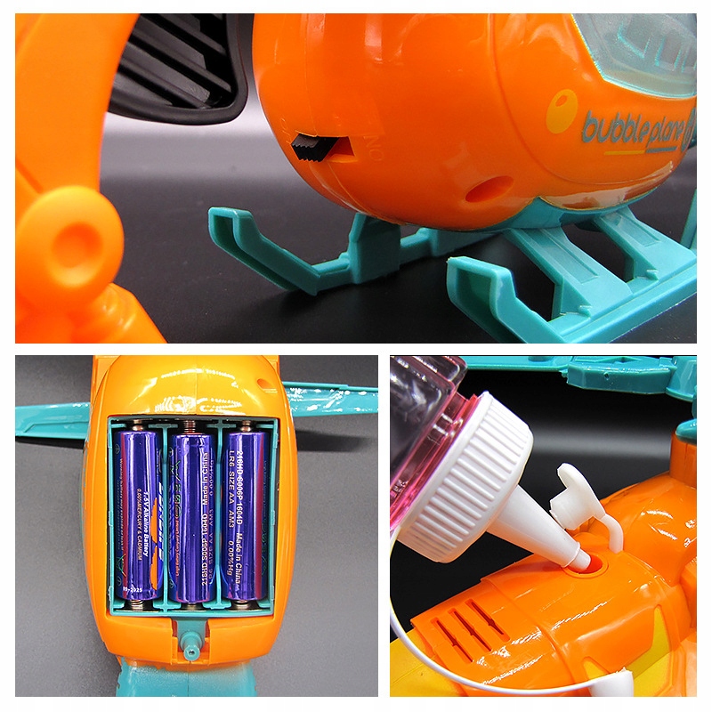 наш пістолет з вертольотом працює від батарей. Перед використанням покладіть акумулятори в машину (не входять до набору). Потім налийте рідину, яка входить у набір пістолетів. Тепер просто закрийте контейнер для рідини, натисніть кнопку , і почнеться генерація великої кількості мильних бульбашок.