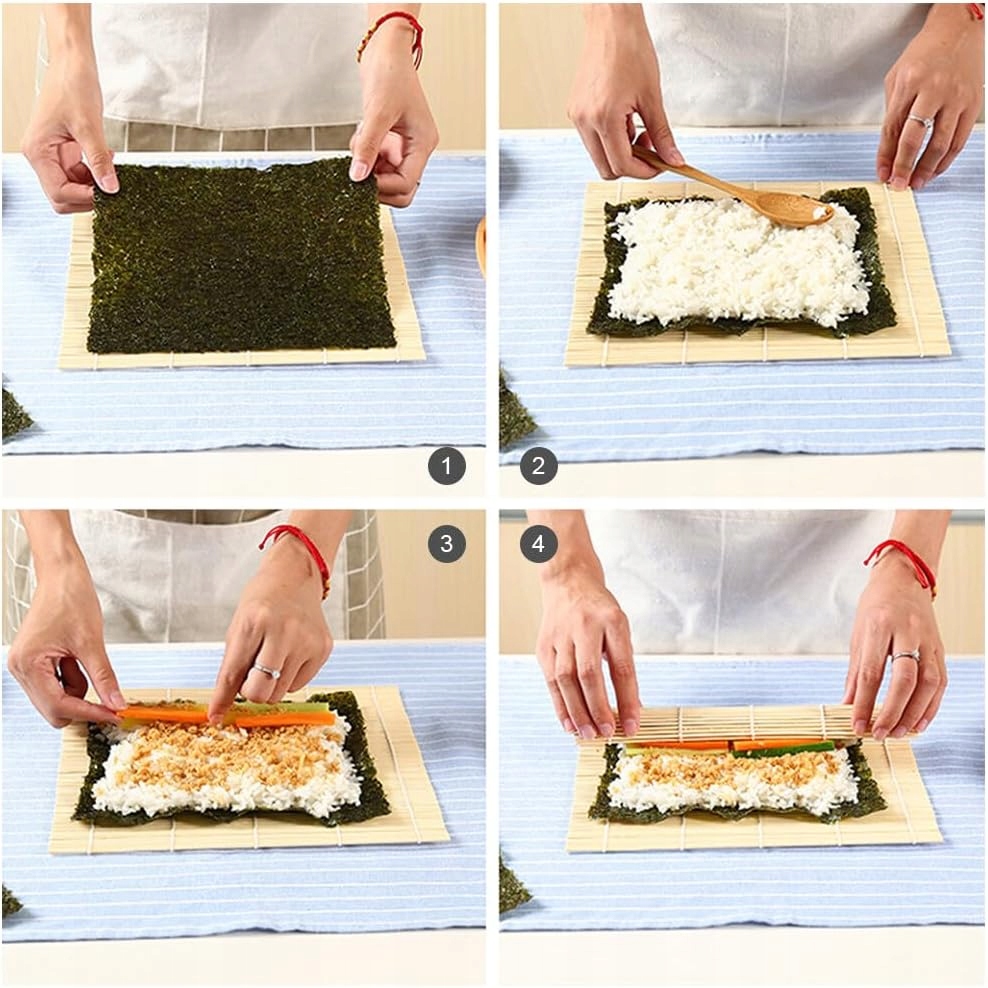 - Наші натуральні бамбукові килимки для суші з'єднані з бавовняними нитками, які не побирають і не використовуватимуть клей. Буде простіше очистити його, якщо покрити бамбуковий килимок суші фольгою, а потім покладіть норі та рис зверху. Висушіть все точно, перш ніж зберігати