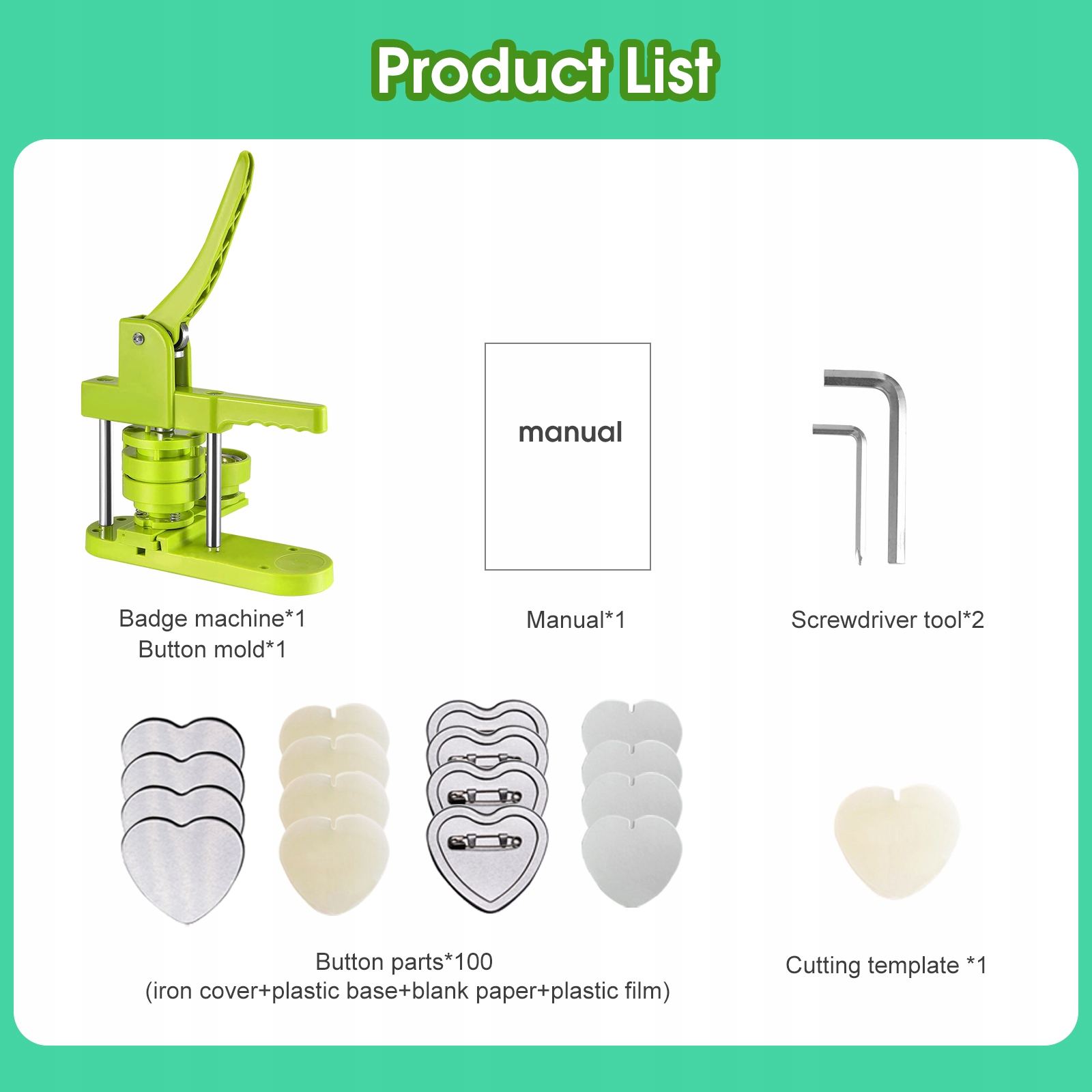 5. Зробіть шпильки для виготовлення табличок: 1 кнопка, що виготовляє машину, 100 частин кнопки, 1 серця -зрізані та 2*гвинти.