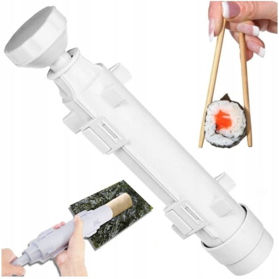 Усі частини виготовлені з харчового матеріалу, що означає, що вони безпечні у використанні. Просто відкрийте базуку для суші, «завантажте» її рисом та іншими інгредієнтами, закрийте та видавіть готові суші.