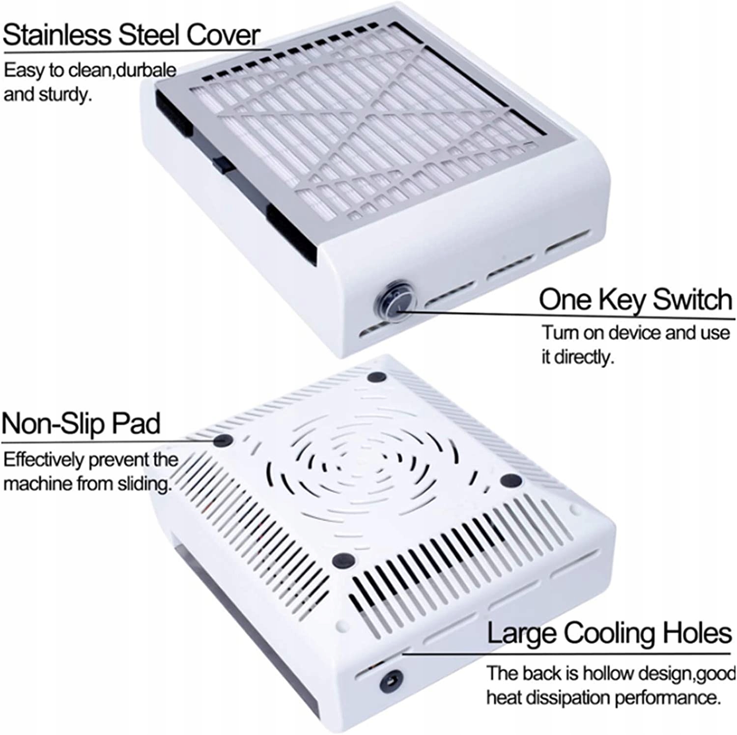 Ідеальний вакуумний ефект. Не розсипає пил і забезпечує чистіше середовище для нейл-арту. тому він може запобігти розсіюванню пилу в повітрі. Це дозволяє вам і вашому клієнту дихати вільно. Порожнистий дизайн Пилозбірник для нігтів має порожнистий дизайн на тильній стороні, що забезпечує потужне розсіювання тепла для пилу з нігтів. Функція постійного відведення тепла захистить вас від пилу. Зручний для чищення Пилозбірник для цвяхів зі знімним фільтром, який може посилити всмоктування пилу, і його дуже легко чистити, просто скористайтеся феном, щоб очистити його. Підходить для манікюрного салону та домашнього використання Вентилятор для нігтів підходить як для професійного використання в салоні, так і для особистого використання. з тихим двигуном і ефективним вакуумним всмоктуванням. Це найкращий інструмент для манікюрного салону. Високоякісна поверхня з нержавіючої сталі, довговічна, приваблива та проста в очищенні, з ефективним збором пилу. Високопотужний всмоктуючий вентилятор потужністю 40 Вт може ефективно поглинати та збирати пил і попіл із нігтів на 360 градусів.