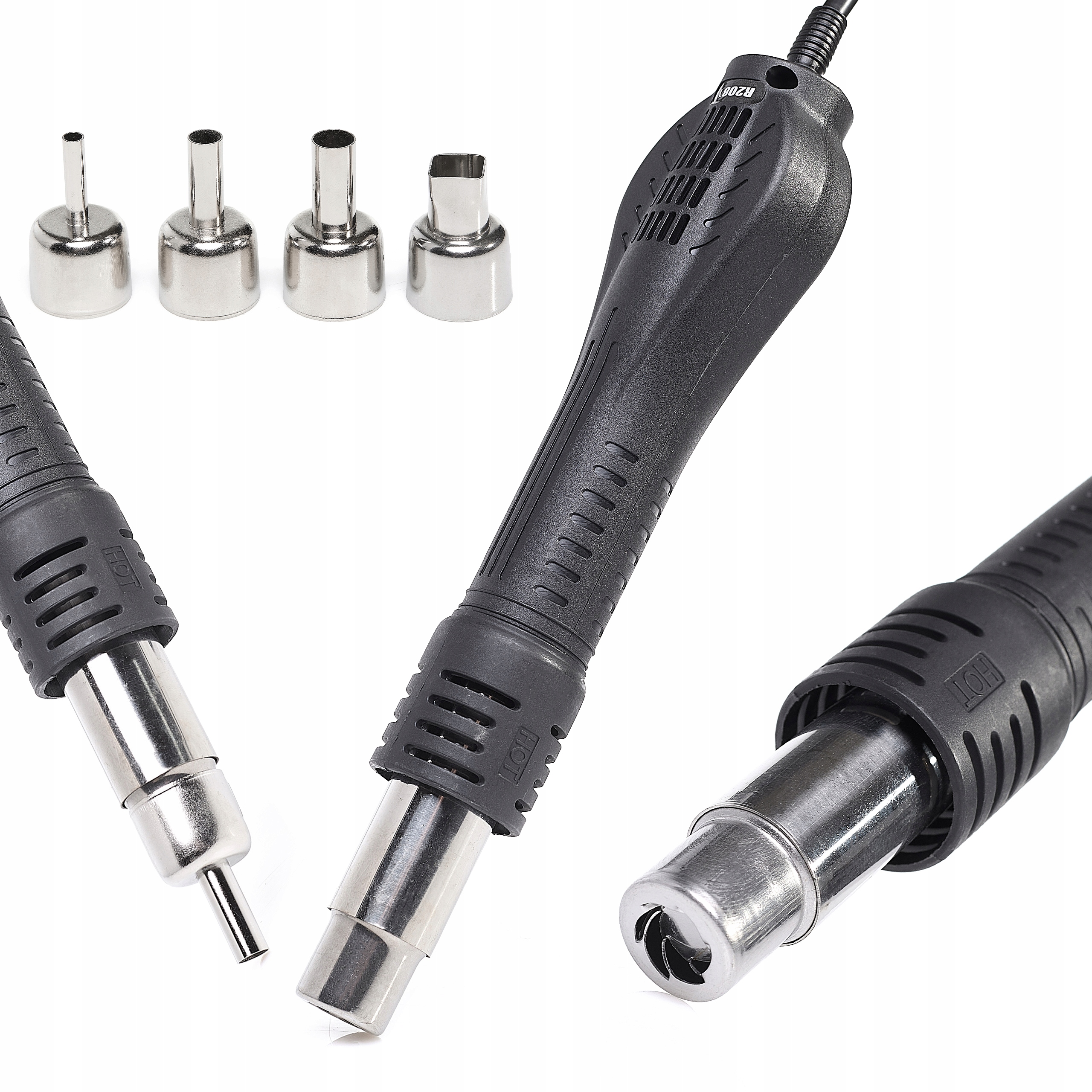У комплекті 4 насадки: три круглі насадки діаметром 5 мм, 8 мм і 10 мм та один квадрат розміром 13 мм додатково щілинне сопло 15 мм, довге вигнуте сопло 7 мм та АЛЕ насадка, . Завдяки цьому ви можете адаптувати інструмент до різноманітних завдань, від точної пайки дрібних деталей до роботи з більшими компонентами.