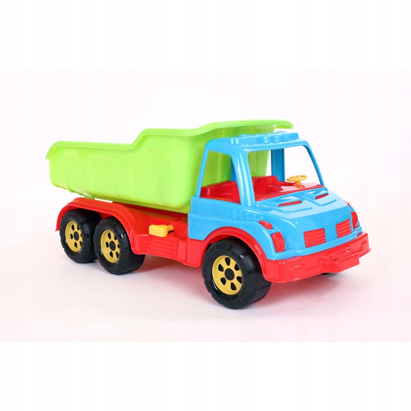 Машина повністю пластикова, легко миється, а це означає, що дитина може грати з нею як вдома, так і в пісочниці, навіть якщо вона вирішить завантажити в причіп щось брудніше піску, це не проблема. Він має дві задні осі та форму, подібну до автомобілів, які перевозять матеріали для будівництва шосе.