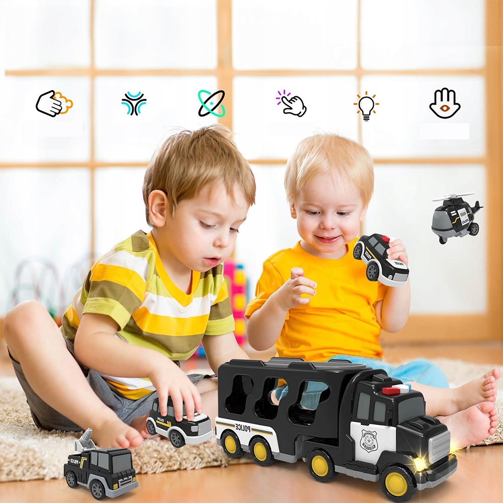 Цей поліцейський транспортний автомобіль 5 в 1 складається з трьох маленьких поліцейських іграшкових автомобілів, невеликого поліцейського іграшкового літака та поліцейської транспортної вантажівки . Унікальний стиль гри захопить вашу дитину. У грі діти можуть створити власну поліцейську рятувальну базу, імітувати роботу поліцейської дільниці та отримати професійне задоволення!