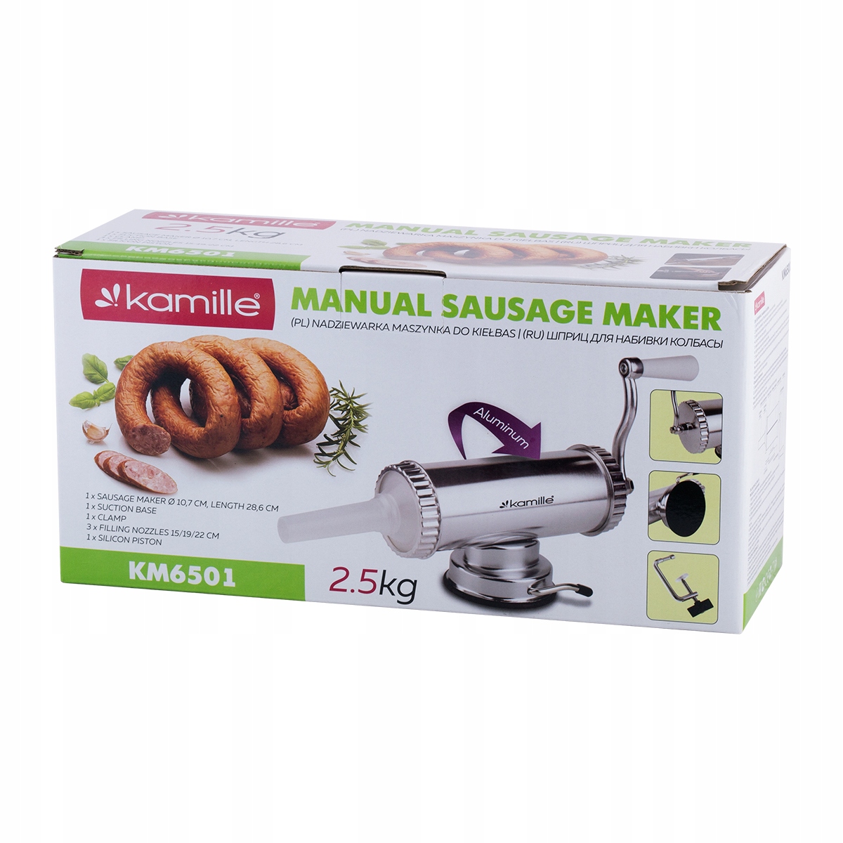 Ручна ковбасна начинка Kamille з об'ємом вхідного м'яса 2,5 кг - ідеальний пристрій для наповнення оболонок начинкою при приготуванні нарізок. Ідеально підходить для приготування домашньої нарізки для подачі на святковий стіл.