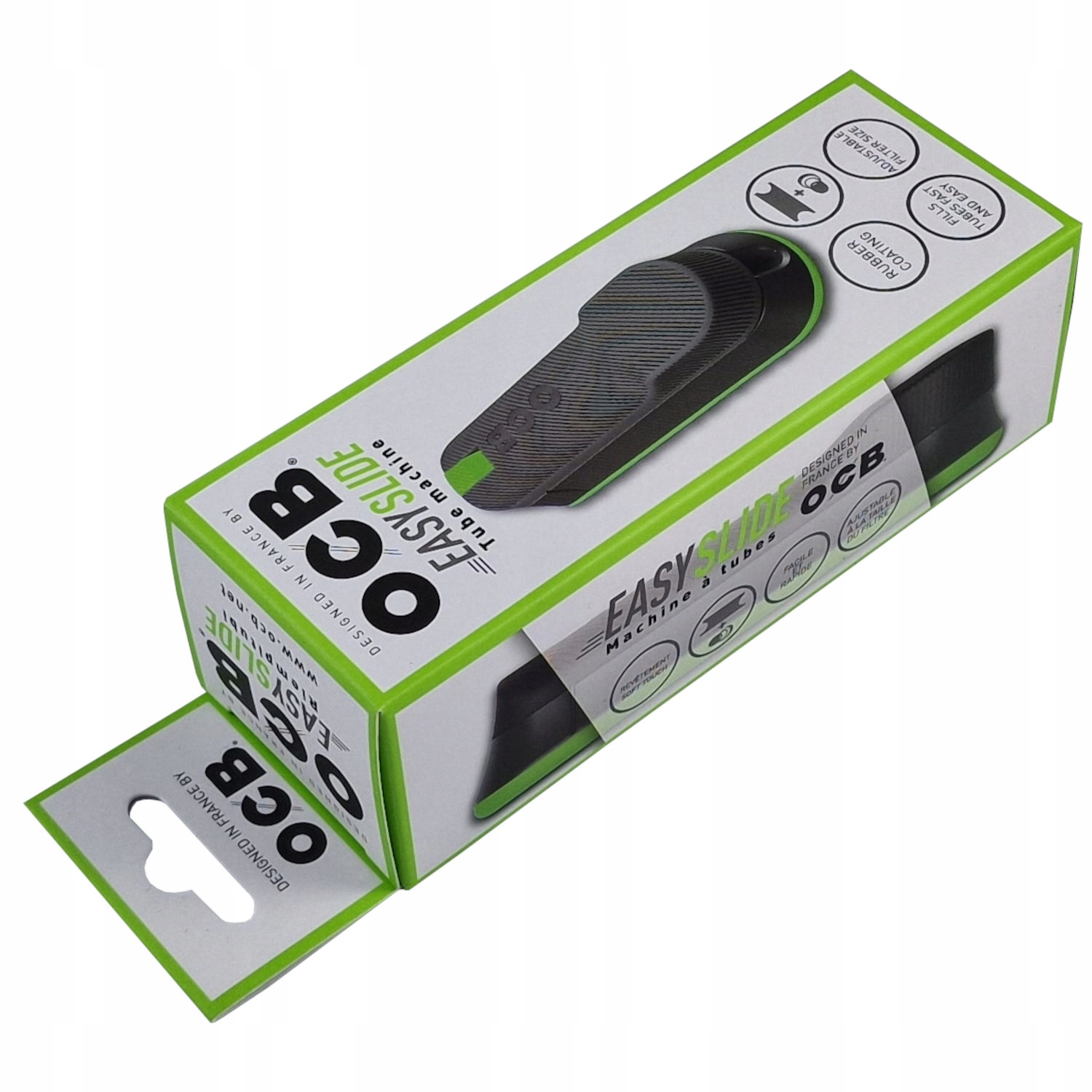 Ручна розфасовка Ocb Easy Slide, корпус машини виготовлений з пластику, верх і низ машини злегка прогумовані, що робить заправку сигарет більш зручною і машинка стабільно тримається на столі або стільниці.