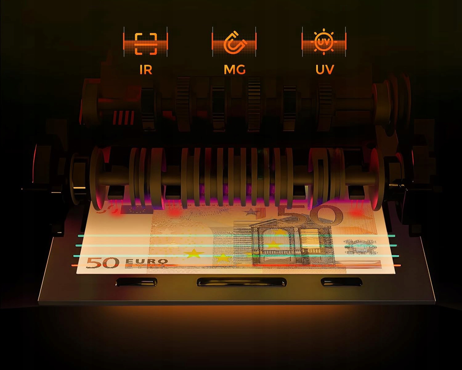 Виявлення підроблених банкнот УФ/ІЧ/мг - пристрій сканує три банкноти за кілька секунд. Крім того, він має функцію виявлення пошкоджених банкнот. Якщо виявлено підозрюваний банкнот, лічильник автоматично зупиняє процес підрахунку та відображає детальне повідомлення про помилку.