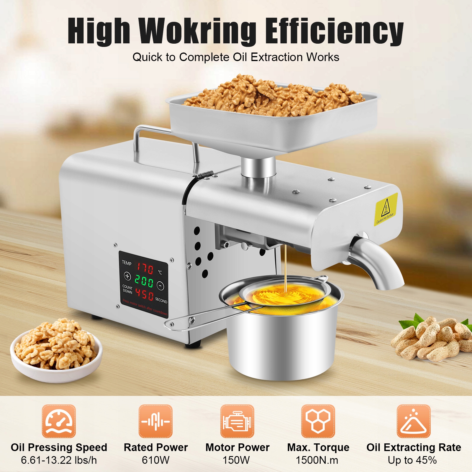 ✅✅Висока ефективність: Завдяки потужному двигуну з чистої міді потужністю 150 Вт цей продукт може штамп сировини 6,61-13,22 фунтів на годину, а швидкість вилучення олії становить до 45%, що дозволяє досягти швидкого та ефективного вилучення олії.