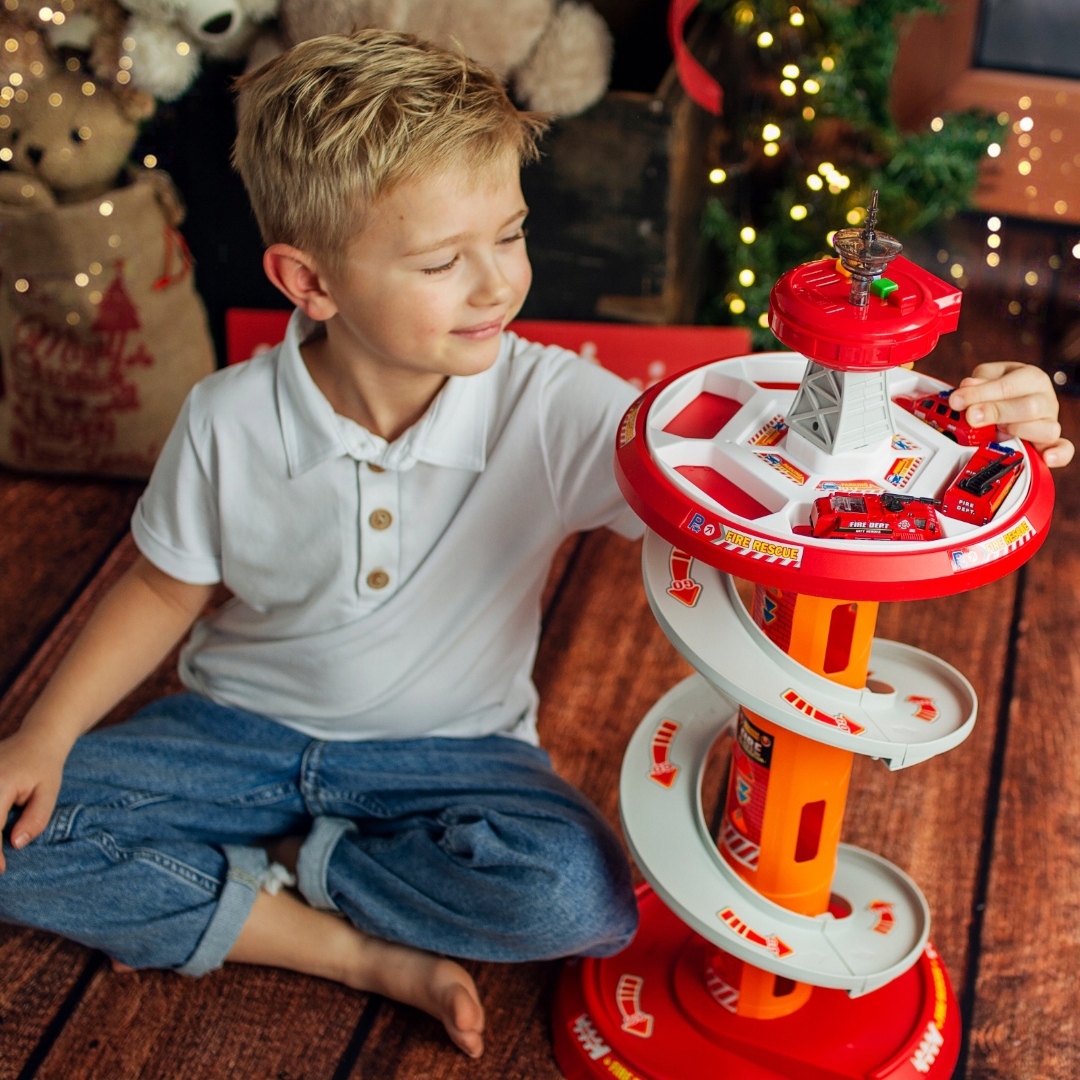 Чудовий багаторівневий паркінг, поворотний гараж для пожежної бригади від Woopie неодмінно сподобається вашій дитині. Ця іграшка розбудить уяву кожного шанувальника уніформених служб, який, виїхавши зі стоянки, виходить на дорогу, що входить до набору. Швидкий спуск машин з окремих рівнів дозволяє здійснити особливий звивистий спуск. Крім того, в набір входять 3 різні пожежні машини.