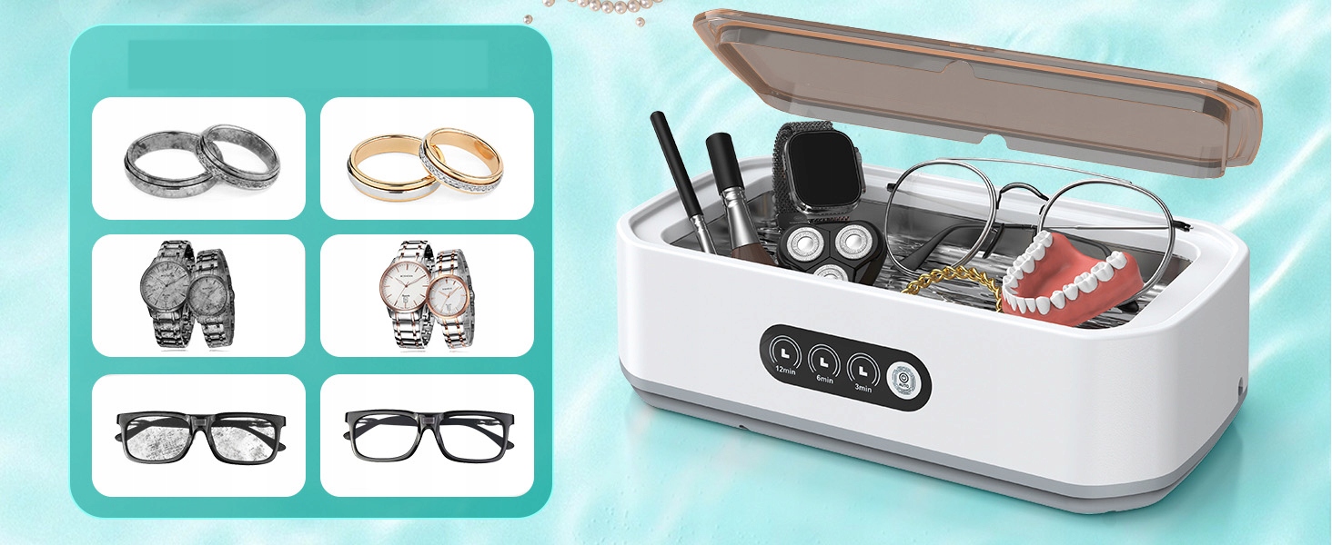 Ультразвуковий очисник пропонує три швидкості очищення: 3 хвилини, 6 хвилин і 12 хвилин. Ви можете вибрати відповідний параметр залежно від того, наскільки забруднений предмет. Ідеально підходить для очищення окулярів, ювелірних виробів, кистей для макіяжу, зубних протезів, бритв тощо.