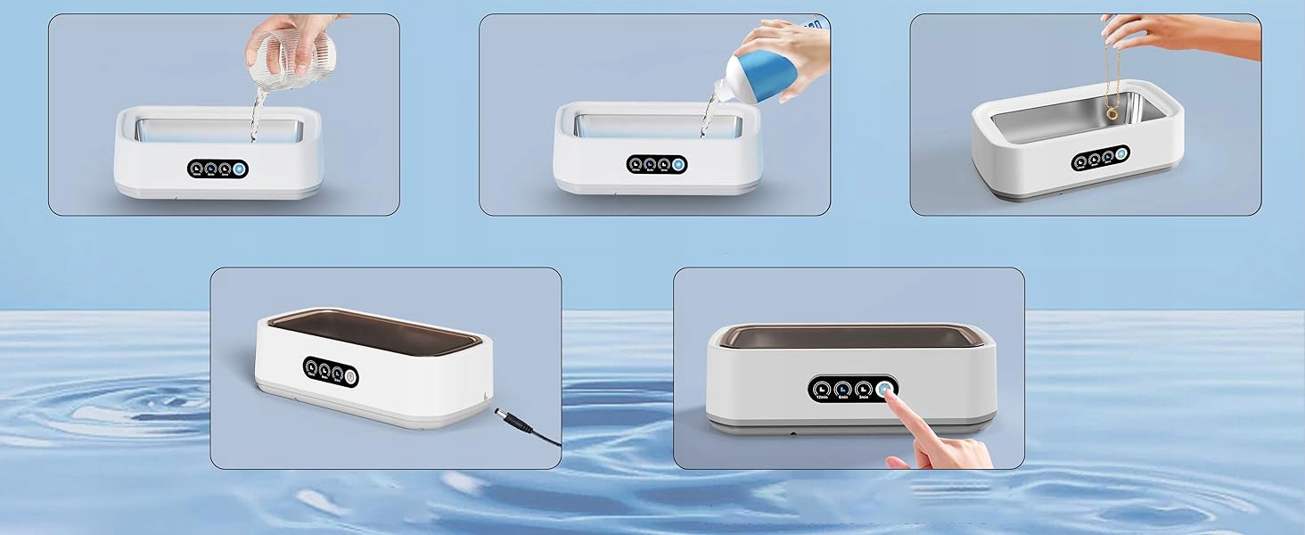 Ультразвуковий пристрій дуже простий у використанні. Просто налийте воду в пристрій. Потім помістіть предмет, який потребує очищення. Нарешті натисніть на вибраний елемент і дочекайтеся завершення очищення.