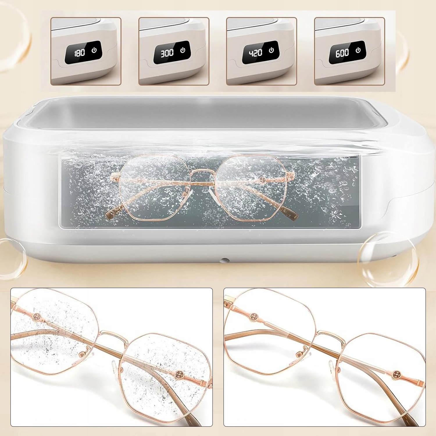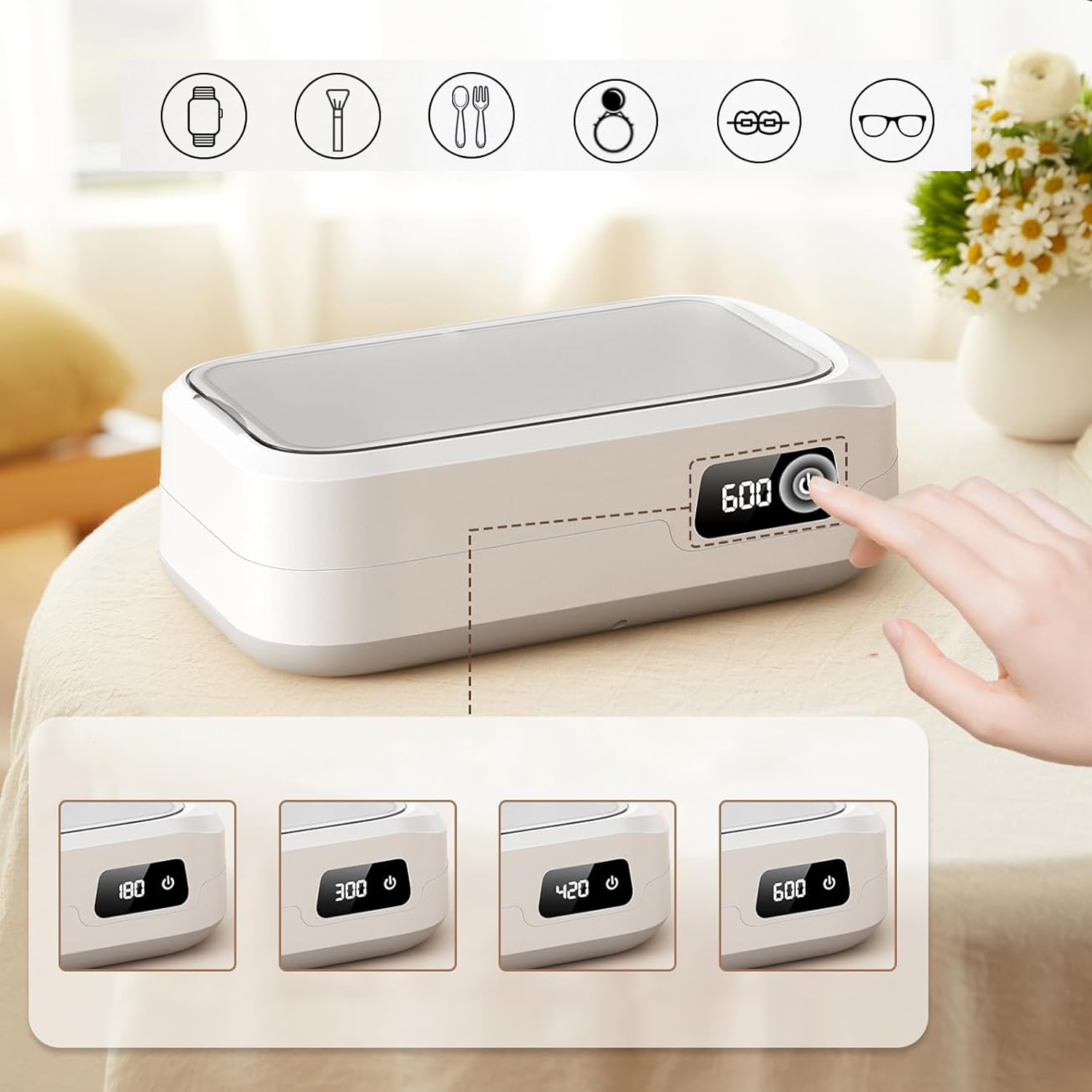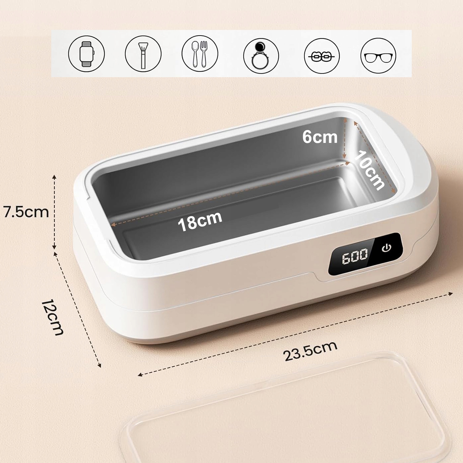 - Він має дуже широкий спектр застосування, підходить для чищення окулярів, ювелірних виробів, годинників, ортодонтичних брекетів, пустушок, косметики, бритв, посуду, зубних щіток, гребінців, кусачок для нігтів, водопровідних труб, тощо