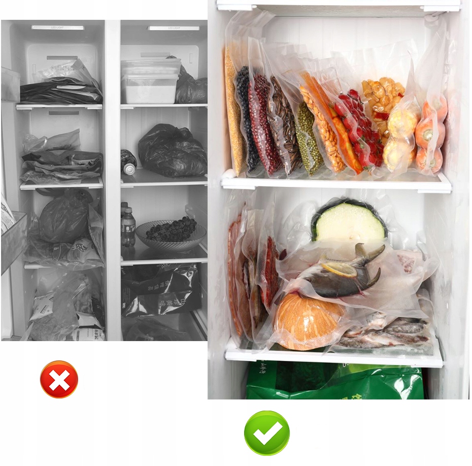 Автоматичний вакуумний запаювач може зберігати свіжість фруктів, горіхів, м’яса, солодощів і овочів і запобігати утворенню та псуванню продуктів у морозилці. Зменшує псування та відходи харчових продуктів.